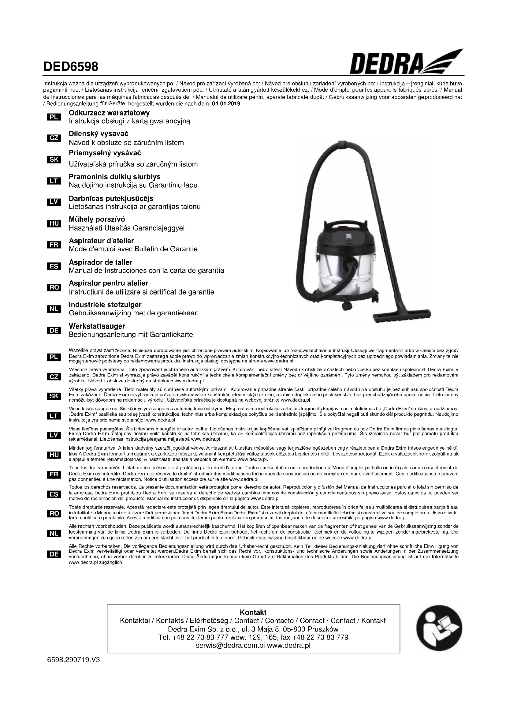 Tous les droits réservés. L'élaboration présente est protégée par le droit d'auteur. Toute représentation ou reproduction du Mode d'emploi partielle ou intégrale sans consentement de Dedra Exim est interdite. Dedra Exim se réserve le droit d'introduire des modifications techniques de construction ou de complément sans avertissement. Ces modifications ne peuvent pas donner lieu à une réclamation. Notice d’utilisation accessible sur le site www.dedra.pl