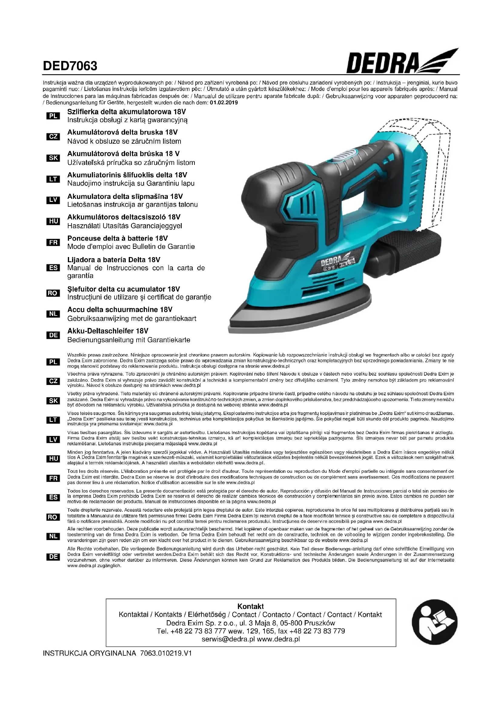 Tous les droits réservés. L'élaboration présente est protégée par le droit d'auteur. Toute représentation ou reproduction du Mode d'emploi partielle ou intégrale sans consentement de Dedra Exim est interdite. Dedra Exim se réserve le droit d'introduire des modifications techniques de construction ou de complément sans avertissement. Ces modifications ne peuvent pas donner lieu à une réclamation. Notice d’utilisation accessible sur le site www.dedra.pl