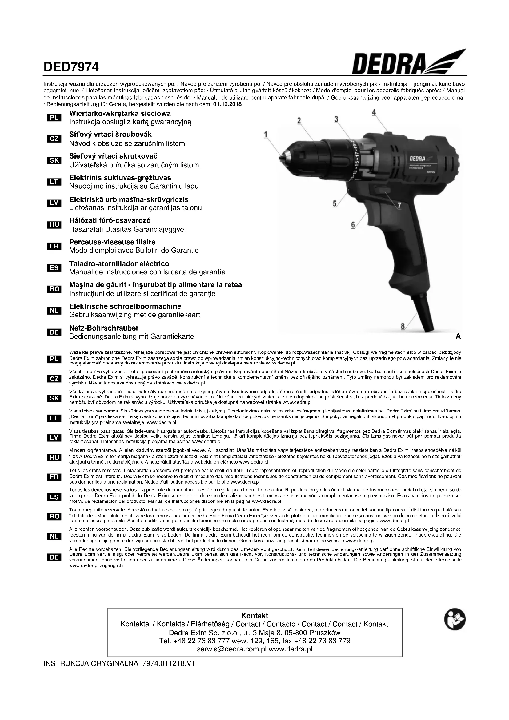Tous les droits réservés. L'élaboration présente est protégée par le droit d'auteur. Toute représentation ou reproduction du Mode d'emploi partielle ou intégrale sans consentement de Dedra Exim est interdite. Dedra Exim se réserve le droit d'introduire des modifications techniques de construction ou de complément sans avertissement. Ces modifications ne peuvent pas donner lieu à une réclamation. Notice d’utilisation accessible sur le site www.dedra.pl