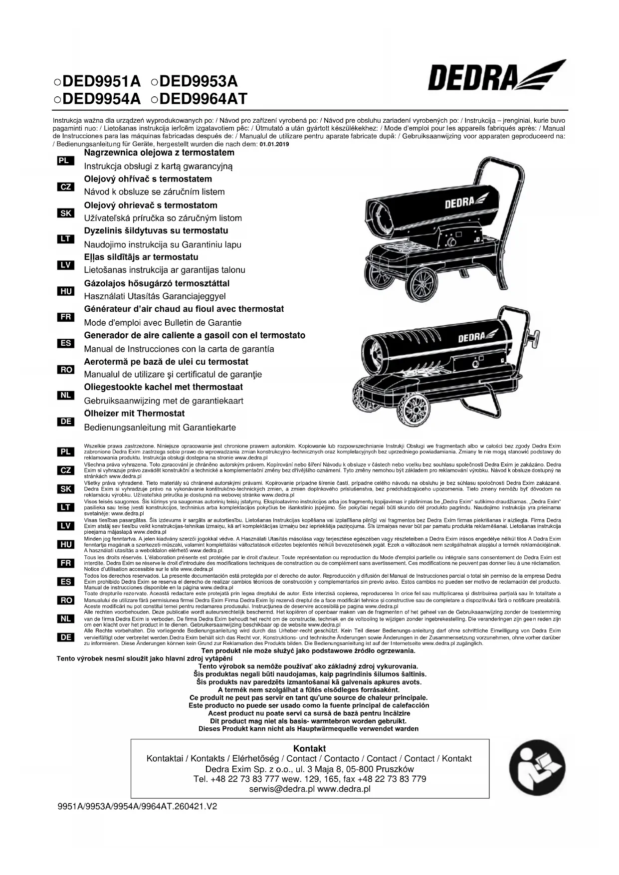 Tous les droits réservés. L'élaboration présente est protégée par le droit d'auteur. Toute représentation ou reproduction du Mode d'emploi partielle ou intégrale sans consentement de Dedra Exim est interdite. Dedra Exim se réserve le droit d'introduire des modifications techniques de construction ou de complément sans avertissement. Ces modifications ne peuvent pas donner lieu à une réclamation. Notice d’utilisation accessible sur le site www.dedra.pl