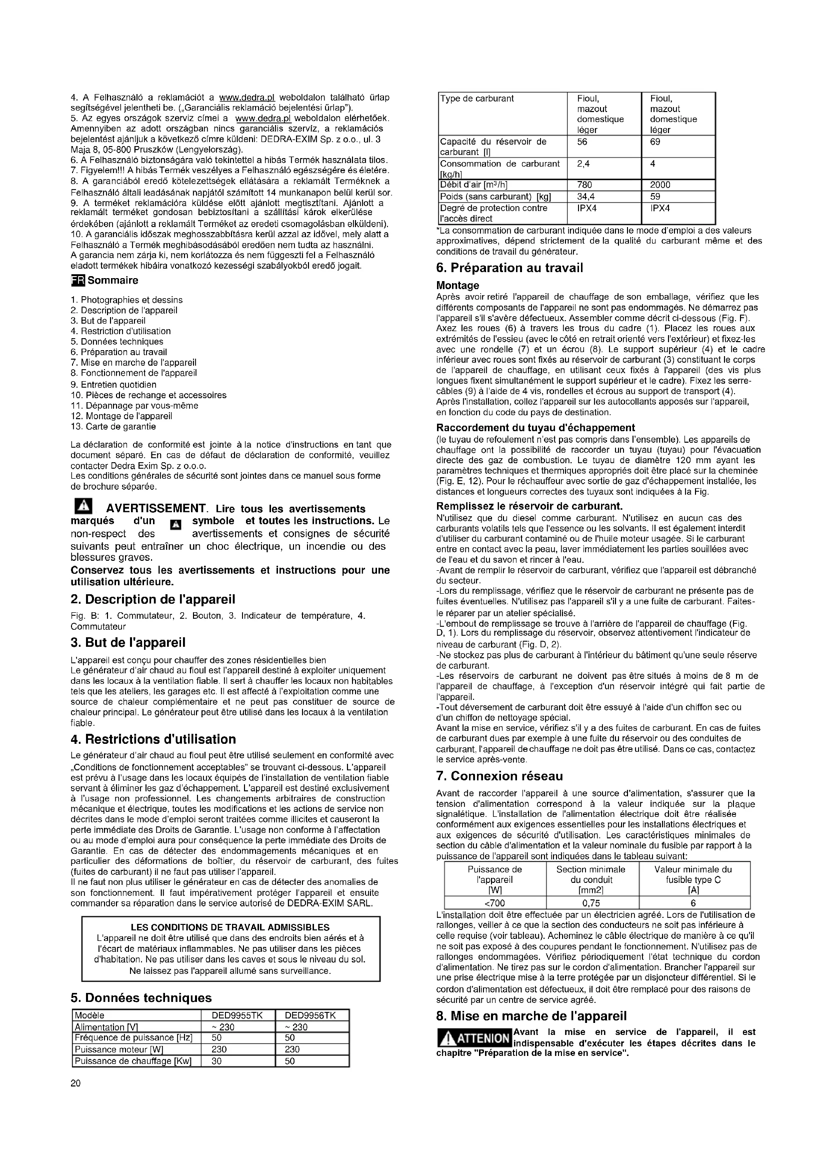 Le générateur d’air chaud au fioul peut être utilisé seulement en conformité avec „Conditions de fonctionnement acceptables” se trouvant ci-dessous. L’appareil est prévu à l’usage dans les locaux équipés de l’installation de ventilation fiable servant à éliminer les gaz d’échappement. L’appareil est destiné exclusivement à l’usage non professionnel. Les changements arbitraires de construction mécanique et électrique, toutes les modifications et les actions de service non décrites dans le mode d’emploi seront traitées comme illicites et causeront la perte immédiate des Droits de Garantie. L’usage non conforme à l’affectation ou au mode d’emploi aura pour conséquence la perte immédiate des Droits de Garantie. En cas de détecter des endommagements mécaniques et en particulier des déformations de boîtier, du réservoir de carburant, des fuites (fuites de carburant) il ne faut pas utiliser l’appareil. Il ne faut non plus utiliser le générateur en cas de détecter des anomalies de son fonctionnement. Il faut impérativement protéger l’appareil et ensuite commander sa réparation dans le service autorisé de DEDRA-EXIM SARL.