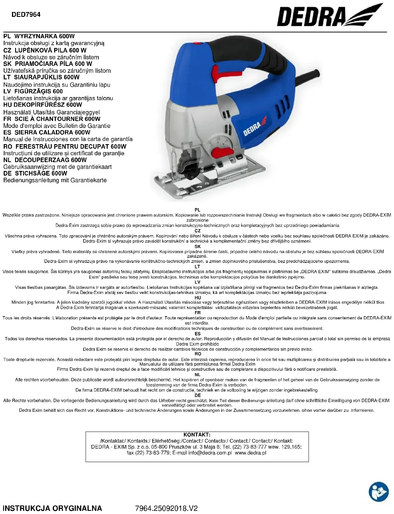 d’achat du Produit, dans le service de garantie ou par écrit à l’adresse: DEDRA EXIM sp. z o.o., ul. 3 Maja 8, 05-800 Pruszków. L’Utilisateur peut faire la réclamation avec le formulaire disponible sur le site web www.dedra.pl. („Formulaire de réclamation à titre de la garantie”). Les adresses de services de garantie sont disponibles pour les pays particuliers sur le site web www.dedra.pl. En cas d’absence du service de garantie pour un pays donné, il est recommandé d’adresser la réclamation à titre de la garantie à l’adresse : DEDRA EXIM sp. z o.o. ul. 3 Maja 8, 05-800 Pruszków (Polska). Vu la sécurité de l’Utilisateur, il est proscrit d’exploiter le Produit défectueux. Attention!!! L’exploitation du Produit défectueux est dangereux pour la santé et la vie de l’Utilisateur.
