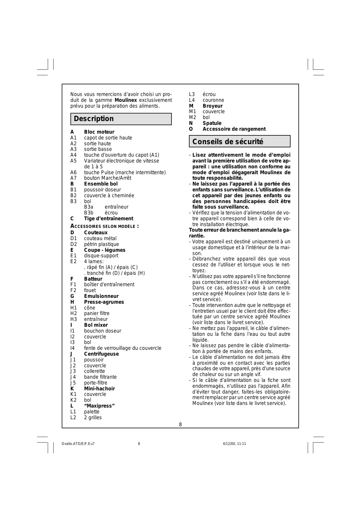 4/12/00, 11:11 - Pour votre sécurité, n’utilisez que des accessoires et des pièces détachées Moulinex adaptés à votre appareil. - Utilisez toujours les poussoirs pour guider les aliments dans les cheminées, jamais les doigts, ni une fourchette, une cuillère, un couteau ou tout autre objet. - N’enlevez les accessoires que lorsque l’appareil est à l’arrêt complet. - N’introduisez jamais d’ustensiles (cuillère, spatule ...) par la cheminée du couvercle. - Ne passez aucun ustensile comportant du métal dans un four à micro-ondes. - N’utilisez qu’un accessoire à la fois. - Manipulez le couteau et les lames avec précaution : ils sont extrêmement coupants. - Vous devez obligatoirement retirer les couteaux (D) et la tige d’entraînement (C) avant de vider le bol de son contenu. - Ne touchez jamais les pièces en mouvement. - Ne faites pas fonctionner votre appareil à vide. - Verrouillez l’entraîneur (B3a) avec l’écrou (B3b) jusqu’à la butée. - Démontez l’ensemble et nettoyez-le après chaque utilisation.