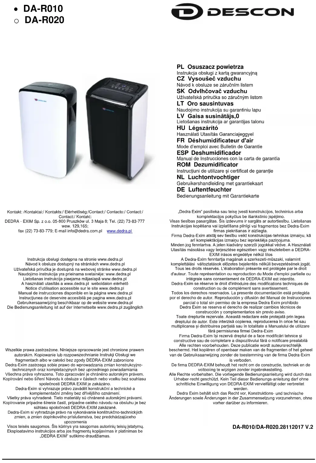 conditions techniques et d'utilisation décrites dans le Mode d'Emploi. Nous garantissons la marchandise pour 24 mois à compter de la date de l'achat inscrite dans le document présent. La garantie est valable sur tout le territoire de la République de Pologne et UE. Les adresses de services des pays particuliers sont disponibles sur la page www.dedra.pl. A défaut de service dans le pays donné, les obligations du garant sont réalisées par le service central. La réclamation devrait être déposée à l'écrit pendant la période de garantie
