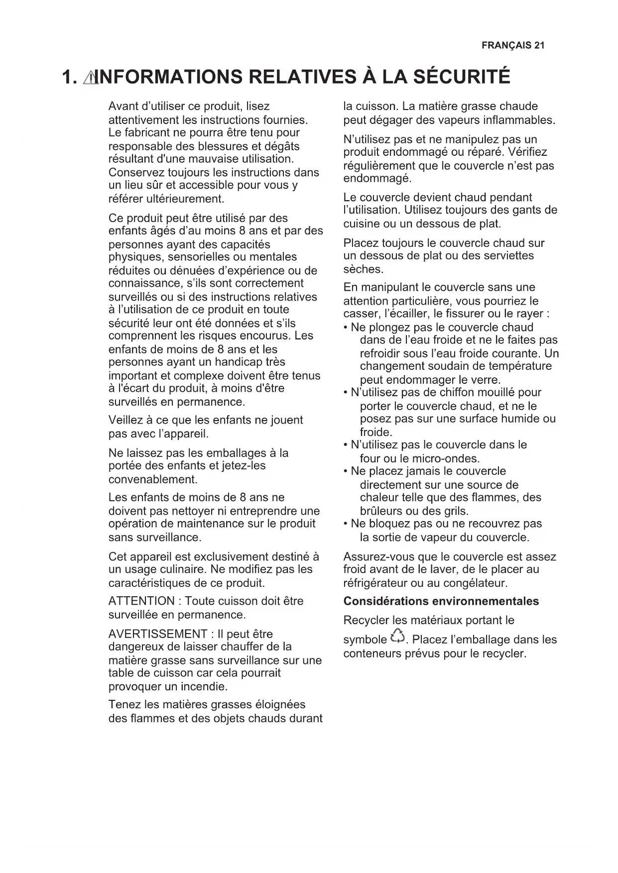 Avant d’utiliser ce produit, lisez attentivement les instructions fournies. Le fabricant ne pourra être tenu pour responsable des blessures et dégâts résultant d'une mauvaise utilisation. Conservez toujours les instructions dans un lieu sûr et accessible pour vous y référer ultérieurement. Ce produit peut être utilisé par des enfants âgés d’au moins 8 ans et par des personnes ayant des capacités physiques, sensorielles ou mentales réduites ou dénuées d’expérience ou de connaissance, s’ils sont correctement surveillés ou si des instructions relatives à l’utilisation de ce produit en toute sécurité leur ont été données et s’ils comprennent les risques encourus. Les enfants de moins de 8 ans et les personnes ayant un handicap très important et complexe doivent être tenus à l'écart du produit, à moins d'être surveillés en permanence. Veillez à ce que les enfants ne jouent pas avec l’appareil. Ne laissez pas les emballages à la portée des enfants et jetez-les convenablement. Les enfants de moins de 8 ans ne doivent pas nettoyer ni entreprendre une opération de maintenance sur le produit sans surveillance. Cet appareil est exclusivement destiné à un usage culinaire. Ne modifiez pas les caractéristiques de ce produit. ATTENTION : Toute cuisson doit être surveillée en permanence.