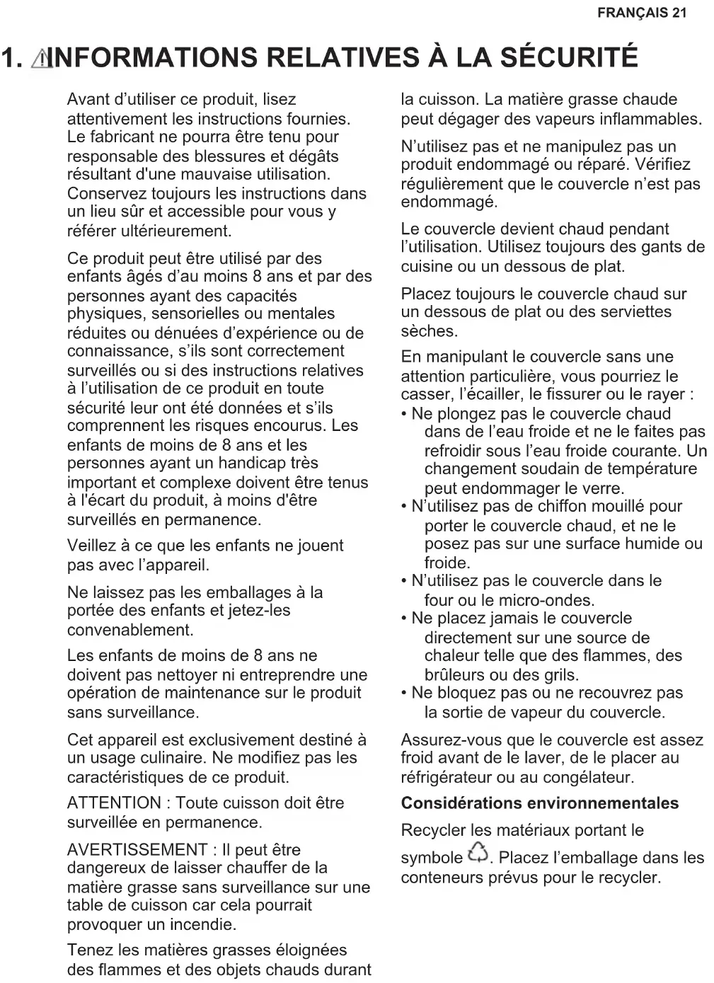 Avant d’utiliser ce produit, lisez attentivement les instructions fournies. Le fabricant ne pourra être tenu pour responsable des blessures et dégâts résultant d'une mauvaise utilisation. Conservez toujours les instructions dans un lieu sûr et accessible pour vous y référer ultérieurement. Ce produit peut être utilisé par des enfants âgés d’au moins 8 ans et par des personnes ayant des capacités physiques, sensorielles ou mentales réduites ou dénuées d’expérience ou de connaissance, s’ils sont correctement surveillés ou si des instructions relatives à l’utilisation de ce produit en toute sécurité leur ont été données et s’ils comprennent les risques encourus. Les enfants de moins de 8 ans et les personnes ayant un handicap très important et complexe doivent être tenus à l'écart du produit, à moins d'être surveillés en permanence. Veillez à ce que les enfants ne jouent pas avec l’appareil. Ne laissez pas les emballages à la portée des enfants et jetez-les convenablement. Les enfants de moins de 8 ans ne doivent pas nettoyer ni entreprendre une opération de maintenance sur le produit sans surveillance. Cet appareil est exclusivement destiné à un usage culinaire. Ne modifiez pas les caractéristiques de ce produit. ATTENTION : Toute cuisson doit être surveillée en permanence.