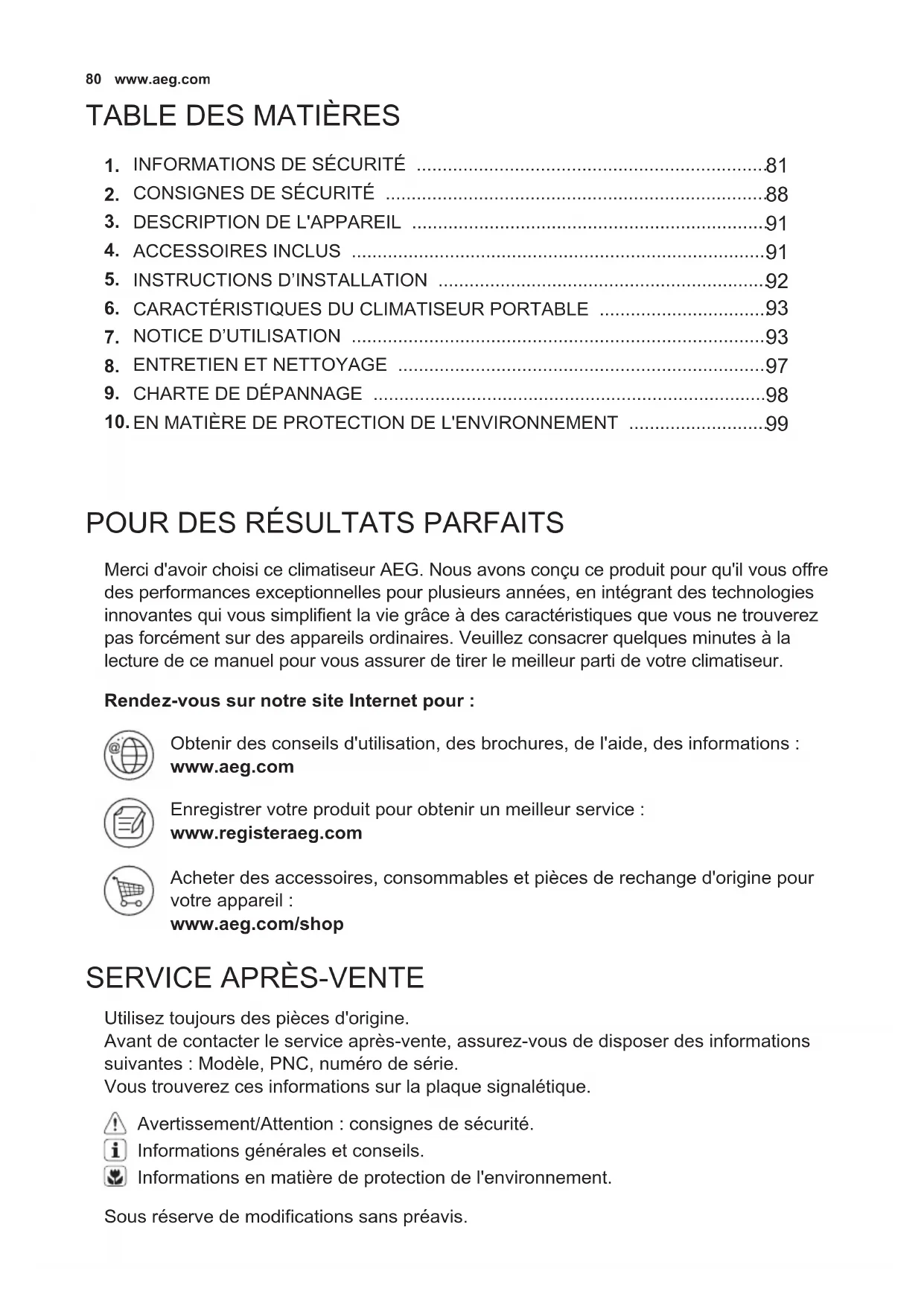 - Si le câble d'alimentation est endommagé, il doit être remplacé par le fabricant, son atelier d'entretien ou un technicien qualifié afin d'éviter tout danger. Ce manuel explique comment utiliser votre nouveau climatiseur portable de manière adéquate. Veuillez lire attentivement ce manuel avant d'utiliser le produit. Conservez ce manuel dans un endroit sûr pour pouvoir le consulter facilement. Symbole Remarque Explication AVERTISSEMENT Ce symbole indique que l'appareil contient un fluide frigorigène inflammable. Si le frigorigène fuit et est exposé à une source d'inflammation externe, il existe un risque d'incendie. ATTENTION Ce symbole indique que le manuel d'utilisation doit être lu attentivement. ATTENTION Ce symbole indique qu'une personne en charge de l'entretien doit manipuler cet équipement conformément au guide d'installation. ATTENTION Ce symbole indique que des informations sont disponibles dans le manuel d'utilisation ou dans le guide d'installation, entre autres.82 www.aeg.com