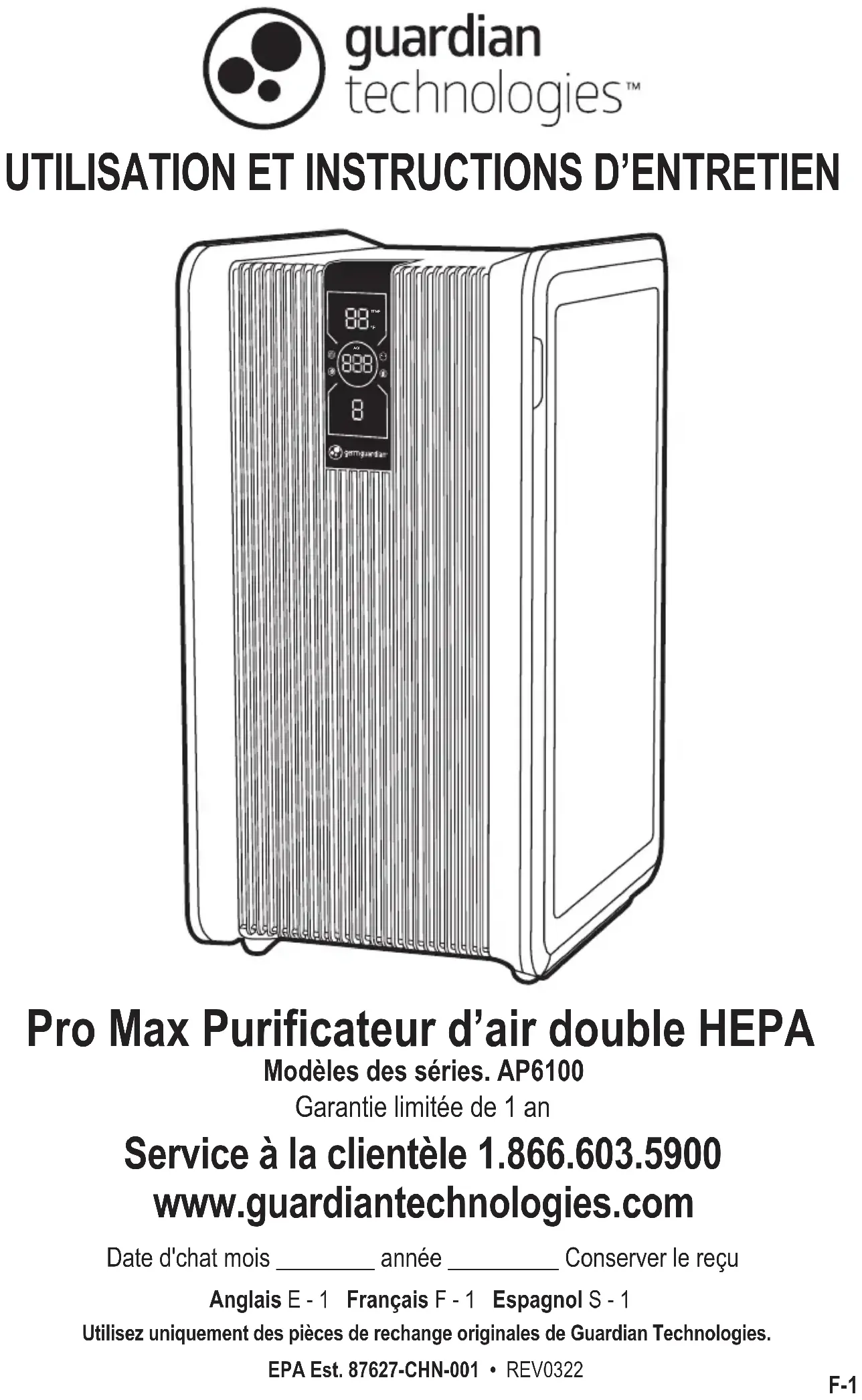 capteur, dans l’ouverture, avec de l’air comprimé. Remarque: N’enfoncez PAS d’objets, ni vos doigts, à l’intérieur de l’appareil. Qu’est-ce que le CADR? CADR est l’acronyme de Clean Air Delivery Rate, soit le volume d’air filtré produit par unpurificateur d’air. Le classement CADR indique l’efficacité d’un purificateur d’air dans sa filtration des particules fines, telles que la fumée de tabac et les pollens de plantes, dans une pièce. Débit d’air pur Comparez les performances des différents purificateurs d’air à l’aide du CADR. Premièrement, repérez la superficiede la pièce suggérée. Puis, consultez les données CADR. Plus la valeur est élevée, plus l’appareil filtre rapidement l’air. Reportez-vous au site web pour chaque modèle de numéros CADRF-9 TROUBLESHOOTING GUIDE Vérifiez que l’appareil est branché sur une prise électrique en état de marche. Vérifiez si le protecteur de moteur est déclenché. Vérifiez que les filtres se trouvent dans l’appareil et que les panneaux sont fermés. PROBLEM L’unité s’éteint de manière inattendue ou ne fonctionne pas. SOLUTION Pas d’air circulant en provenance de l’appareil. Débranchez l’appareil. Vérifiez les filtres. Nettoyez ou remplacez les filtres si nécessaire. Augmentation du niveau de bruit. Assurez-vous que les filtres sont propres. Remplacez-les si nécessaire. Assurez-vous que les orifices d’aération ne sont pas obstrués. Éteignez l’appareil et redémarrez-le après 15 minutes. Les odeurs et la fumée ne sont pas éliminées. Nettoyez ou remplacez les filtres. L’état de la qualité de l’air reste médiocre. Vérifiez si le filtre est très sale. Remplacez-le si nécessaire. Augmentez la vitesse du ventilateur pour faire circuler l’air. L’air évacué a un arôme ou une odeur. Vérifiez si les filtres sont très sales. Remplacez les filtres. L’appareil passe automatiquement en mode veille dans les environnements bien éclairés. Vérifiez que rien ne bloque le capteur de lumière. L’affichage AQI ne fonctionne pas correctement. Vérifiez que le capteur de poussière est propre. Vérifiez si les filtres sont très sales. Remplacez les filtres.GARANTIE LIMITÉE Des copies supplémentaires de ce manuel d’utilisation peuvent être obtenues sur notre site Internet puis imprimées, ou en appelant le service à la clientèle. ©2016 Guardian Technologies LLC Guardian Technologies LLC garantit au consommateur que cet appareil est exempt de défauts matériels ou de fabrication, à partir de la date d'achat originale. Afin d’être admissible à cette Garantie limitée, un reçu de vente original ou une autre preuve d’achat substitut comparable portant la date de l’achat original est requis. Consultez la boîte de produit originale ou la page du produit/modèle spécifique sur le site Web de Guardian Technologies pour la période de garantie concernant votre modèle en particulier. Cette garantie s’applique seulement à l’acheteur original de ce produit à partir de la date d’achat originale. Cette garantie couvre un appareil acheté uniquement auprès de distributeurs agréés. Cette garantie ne couvre pas les produits Guardian Technologies qui sont utilisés en dehors des États-Unis et du Canada, car l'appareil doit être branché directement sur une prise électrique de 120 Vca sans utiliser d'adaptateur. Cette garantie s’applique à la réparation ou au remplacement du produit trouvé défectueux au niveau des matériaux ou de la fabrication. Cette garantie ne s’applique pas aux dommages découlant d’une usure inhabituelle, d’une utilisation commerciale, abusive ou déraisonnable ou de dommages additionnels. Cette garantie ne couvre pas les dommages causés par des réparations non autorisées ou de toute utilisation non conforme avec le manuel des instructions. Les défaillances découlant d’une usure normale ne seront pas considérées des défauts de fabrication selon la présente garantie. Si cet appareil s’avère défectueux pendant la période de garantie, nous réparerons ou remplacerons gratuitement toutes les pièces défectueuses. Toute réparation couverte par la présente garantie doit être effectuée par Guardian Technologies LLC. La présente garantie vous donne certains droits juridiques. Vous pouvez également bénéficier d’autres droits (les droits peuvent varier d’un État à l’autre aux États-Unis). Pour faire valoir la présente garantie, l’appareil complet doit être envoyé en port payé à Guardian Technologies LLC. Veuillez inclure les renseignements complets, y compris : la nature du problème, le numéro de modèle, la date d’achat, et incluez vos nom, adresse et numéro de téléphone (courriel facultatif) ainsi qu’une copie du reçu de vente original. Retournez l’appareil à l’attention de : Service des réparations, à l’adresse indiquée ci-dessous. Adressez vos questions ou vos commentaires au numéro sans frais indiqué ci-après. États-Unis et Canada Guardian Technologies LLC 26251 Bluestone Blvd. Euclid, Ohio 44132
