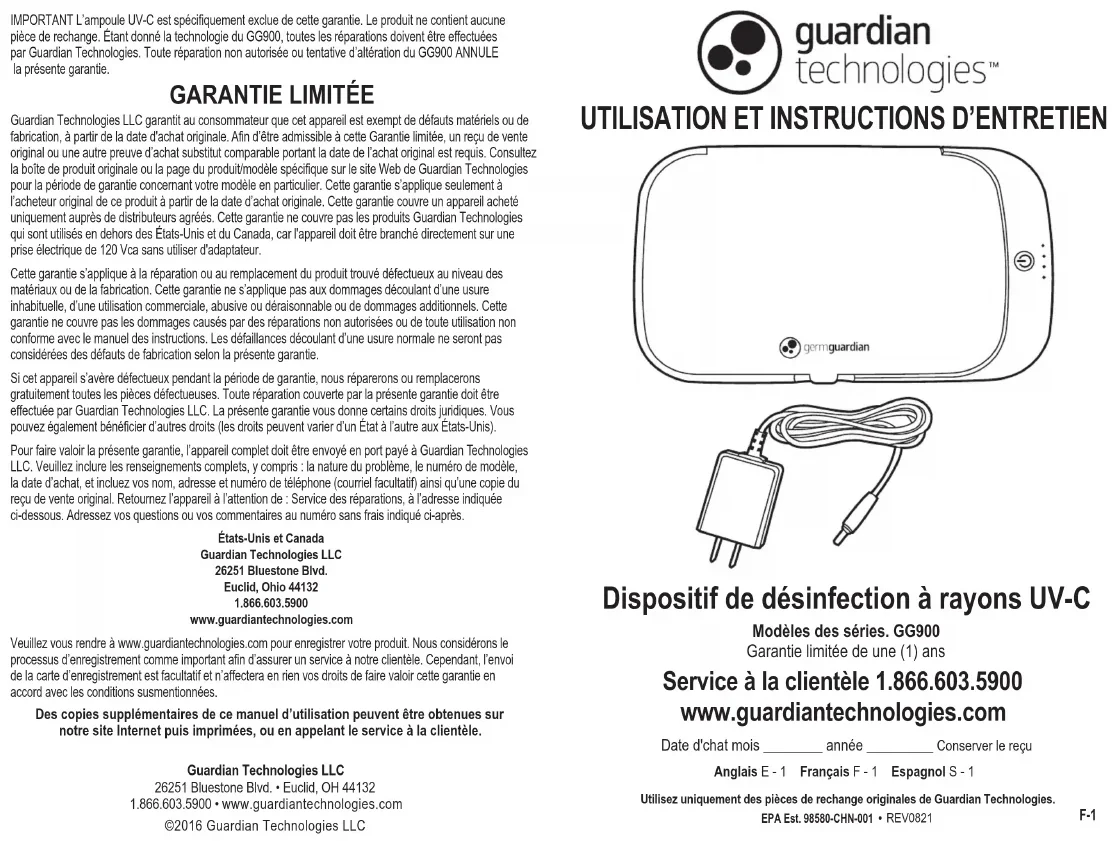 Service à la clientèle 1.866.603.5900 www.guardiantechnologies.com F-1 ©2016 Guardian Technologies LLCGuardian Technologies LLC26251 Bluestone Blvd. • Euclid, OH 441321.866.603.5900 • www.guardiantechnologies.comIMPORTANT L’ampoule UV-C est spécifiquement exclue de cette garantie. Le produit ne contient aucunepièce de rechange. Étant donné la technologie du GG900, toutes les réparations doivent être effectuéespar Guardian Technologies. Toute réparation non autorisée ou tentative d’altération du GG900 ANNULE la présente garantie.