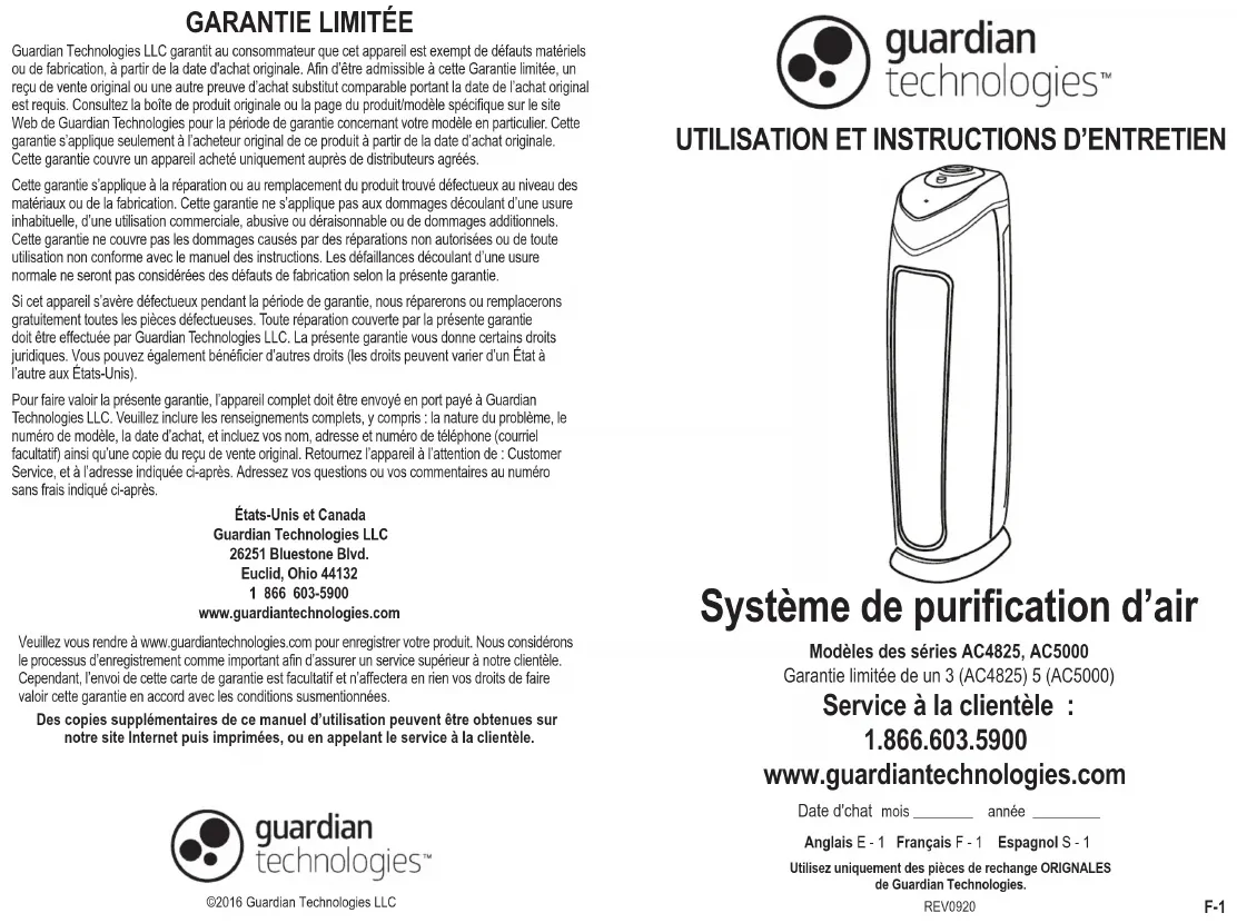 Des copies supplémentaires de ce manuel d’utilisation peuvent être obtenues sur notre site Internet puis imprimées, ou en appelant le service à la clientèle.©2016 Guardian Technologies LLCGuardian Technologies LLC garantit au consommateur que cet appareil est exempt de défauts matérielsou de fabrication, à partir de la date d'achat originale. Afin d’être admissible à cette Garantie limitée, un reçu de vente original ou une autre preuve d’achat substitut comparable portant la date de l’achat original est requis. Consultez la boîte de produit originale ou la page du produit/modèle spécifique sur le site Web de Guardian Technologies pour la période de garantie concernant votre modèle en particulier. Cette garantie s’applique seulement à l’acheteur original de ce produit à partir de la date d’achat originale. Cette garantie couvre un appareil acheté uniquement auprès de distributeurs agréés.Cette garantie s’applique à la réparation ou au remplacement du produit trouvé défectueux au niveau des matériaux ou de la fabrication. Cette garantie ne s’applique pas aux dommages découlant d’une usure inhabituelle, d’une utilisation commerciale, abusive ou déraisonnable ou de dommages additionnels. Cette garantie ne couvre pas les dommages causés par des réparations non autorisées ou de toute utilisation non conforme avec le manuel des instructions. Les défaillances découlant d’une usure normale ne seront pas considérées des défauts de fabrication selon la présente garantie.Si cet appareil s’avère défectueux pendant la période de garantie, nous réparerons ou remplacerons gratuitement toutes les pièces défectueuses. Toute réparation couverte par la présente garantie doit être effectuée par Guardian Technologies LLC. La présente garantie vous donne certains droits juridiques. Vous pouvez également bénéficier d’autres droits (les droits peuvent varier d’un État à l’autre aux États-Unis).Pour faire valoir la présente garantie, l’appareil complet doit être envoyé en port payé à Guardian Technologies LLC. Veuillez inclure les renseignements complets, y compris : la nature du problème, le numéro de modèle, la date d’achat, et incluez vos nom, adresse et numéro de téléphone (courriel facultatif) ainsi qu’une copie du reçu de vente original. Retournez l’appareil à l’attention de : Customer Service, et à l’adresse indiquée ci-après. Adressez vos questions ou vos commentaires au numéro sans frais indiqué ci-après. États-Unis et CanadaGuardian Technologies LLC26251 Bluestone Blvd.Euclid, Ohio 441321866603-5900www.guardiantechnologies.comVeuillez vous rendre à www.guardiantechnologies.com pour enregistrer votre produit. Nous considérons le processus d’enregistrement comme important afin d’assurer un service supérieur à notre clientèle. Cependant, l’envoi de cette carte de garantie est facultatif et n’affectera en rien vos droits de faire valoir cette garantie en accord avec les conditions susmentionnées. F-1 Système de purification d’air Modèles des séries AC4825, AC5000 Garantie limitée de un 3 (AC4825) 5 (AC5000) Anglais E - 1 Français F - 1 Espagnol S - 1 Date d'chat mois ________ année _________ Service à la clientèle: