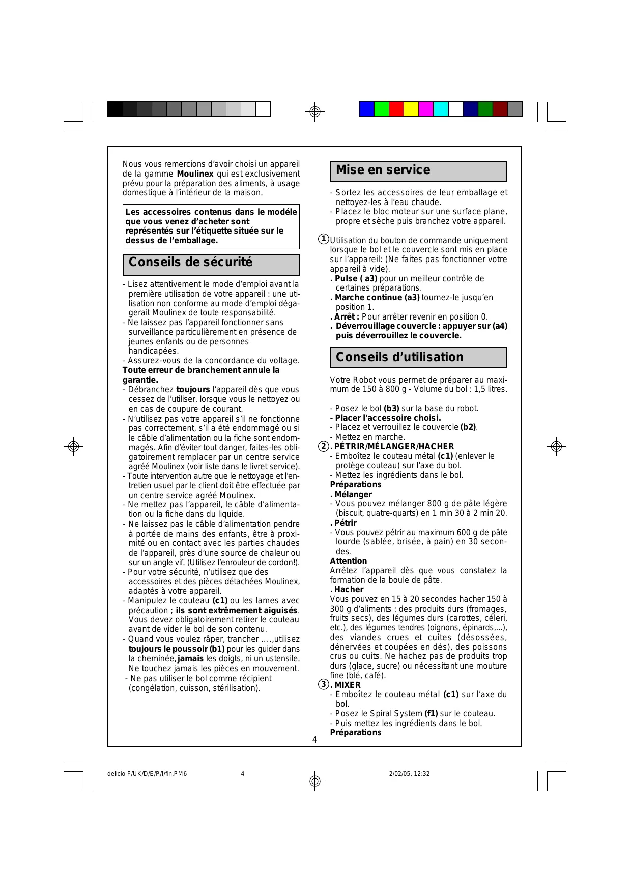 Nous vous remercions d’avoir choisi un appareil de la gamme Moulinex qui est exclusivement prévu pour la préparation des aliments, à usage domestique à l’intérieur de la maison. Mise en service - Sortez les accessoires de leur emballage et nettoyez-les à l’eau chaude. - Placez le bloc moteur sur une surface plane, propre et sèche puis branchez votre appareil. Les accessoires contenus dans le modéle que vous venez d’acheter sont représentés sur l’étiquette située sur le dessus de l’emballage. 1 Utilisation du bouton de commande uniquement lorsque le bol et le couvercle sont mis en place sur l’appareil: (Ne faites pas fonctionner votre appareil à vide). . Pulse ( a3) pour un meilleur contrôle de certaines préparations. . Marche continue (a3) tournez-le jusqu’en position 1. . Arrêt : Pour arrêter revenir en position 0. . Déverrouillage couvercle : appuyer sur (a4) puis déverrouillez le couvercle. Conseils de sécurité - Lisez attentivement le mode d’emploi avant la première utilisation de votre appareil : une utilisation non conforme au mode d’emploi dégagerait Moulinex de toute responsabilité. - Ne laissez pas l’appareil fonctionner sans surveillance particulièrement en présence de jeunes enfants ou de personnes handicapées. - Assurez-vous de la concordance du voltage. Toute erreur de branchement annule la garantie. - Débranchez toujours l’appareil dès que vous cessez de l’utiliser, lorsque vous le nettoyez ou en cas de coupure de courant. - N’utilisez pas votre appareil s’il ne fonctionne pas correctement, s’il a été endommagé ou si le câble d’alimentation ou la fiche sont endommagés. Afin d’éviter tout danger, faites-les obligatoirement remplacer par un centre service agréé Moulinex (voir liste dans le livret service). - Toute intervention autre que le nettoyage et l’entretien usuel par le client doit être effectuée par un centre service agréé Moulinex. - Ne mettez pas l’appareil, le câble d’alimentation ou la fiche dans du liquide. - Ne laissez pas le câble d’alimentation pendre à portée de mains des enfants, être à proximité ou en contact avec les parties chaudes de l’appareil, près d’une source de chaleur ou sur un angle vif. (Utilisez l’enrouleur de cordon!). - Pour votre sécurité, n’utilisez que des accessoires et des pièces détachées Moulinex, adaptés à votre appareil. - Manipulez le couteau (c1) ou les lames avec précaution ; ils sont extrêmement aiguisés. Vous devez obligatoirement retirer le couteau avant de vider le bol de son contenu. - Quand vous voulez râper, trancher ….,utilisez toujours le poussoir (b1) pour les guider dans la cheminée, jamais les doigts, ni un ustensile. Ne touchez jamais les pièces en mouvement. - Ne pas utiliser le bol comme récipient (congélation, cuisson, stérilisation). Conseils d’utilisation Votre Robot vous permet de préparer au maximum de 150 à 800 g - Volume du bol : 1,5 litres.
