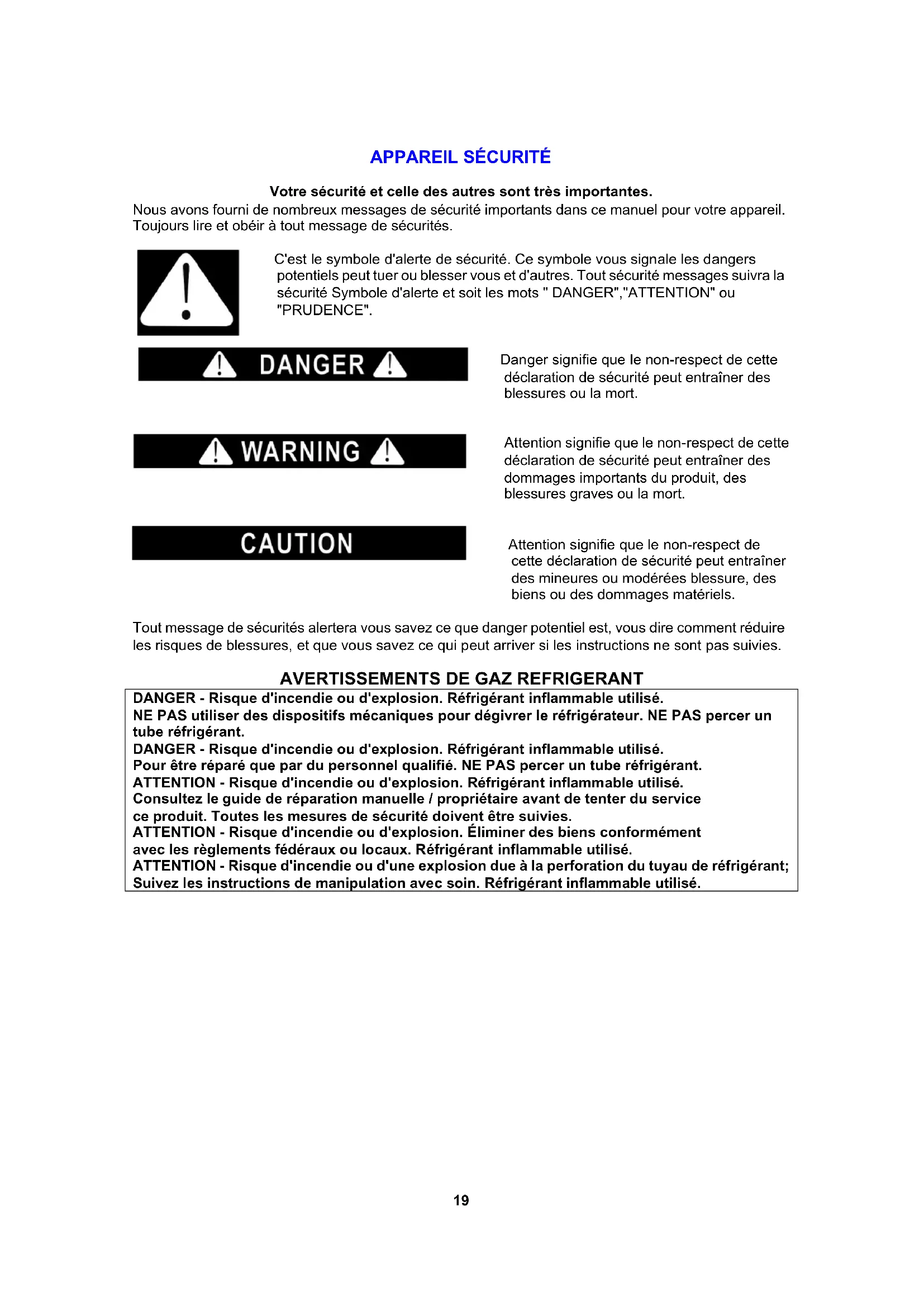 DANGER - Risque d'incendie ou d'explosion. Réfrigérant inflammable utilisé. NE PAS utiliser des dispositifs mécaniques pour dégivrer le réfrigérateur. NE PAS percer un tube réfrigérant. DANGER - Risque d'incendie ou d'explosion. Réfrigérant inflammable utilisé. Pour être réparé que par du personnel qualifié. NE PAS percer un tube réfrigérant. ATTENTION - Risque d'incendie ou d'explosion. Réfrigérant inflammable utilisé. Consultez le guide de réparation manuelle / propriétaire avant de tenter du service ce produit. Toutes les mesures de sécurité doivent être suivies. ATTENTION - Risque d'incendie ou d'explosion. Éliminer des biens conformément avec les règlements fédéraux ou locaux. Réfrigérant inflammable utilisé. ATTENTION - Risque d'incendie ou d'une explosion due à la perforation du tuyau de réfrigérant; Suivez les instructions de manipulation avec soin. Réfrigérant inflammable utilisé.20