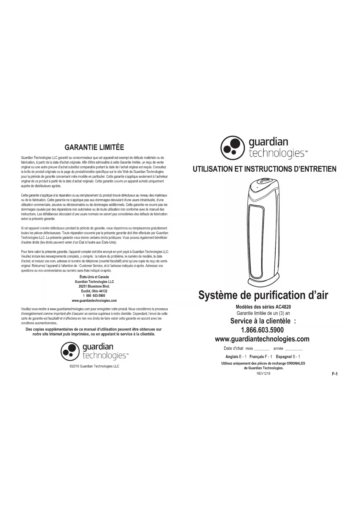 Panneau de commandeSortie d’air Base Entrée d’airCorps de l’appareiBouton de mise en marcheBouton activer/désactiver HEPA Poignée de transport Couvercle d’accès du filtre Devant de l’appareil Arrière de l’appareil F-4 F-5 NIVEAUX DE LA PURIFICATION DE L’AIR Appareilbouton de verrouillage et de déverrouillage (pour accéderau ltre)Indicateur marche/arrêt Indicateur de remplacement de filtreCheck out ourDécouvrez notre programme en ligne de rappel de remplacement des filtres. www.guardiantechnologies.com FILTRE: Filtre No de modèle FLT4825