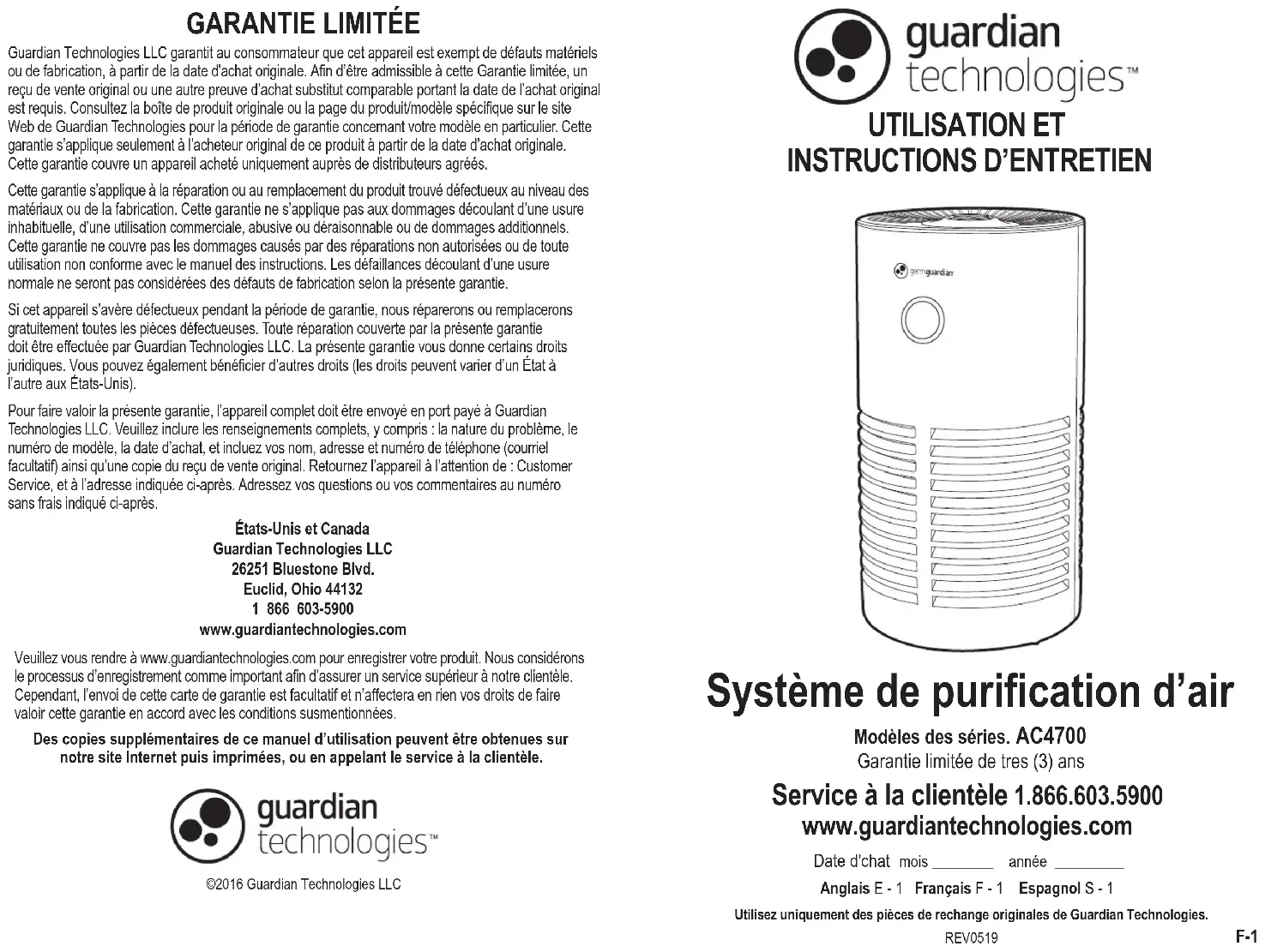 Modèles des séries. AC4700Garantie limitée de tres (3) ans Anglais E - 1 Français F - 1 Espagnol S - 1 Date d'chat mois ________ année _________ Service à la clientèle 1.866.603.5900 www.guardiantechnologies.com Utilisez uniquement des pièces de rechange originales de Guardian Technologies.REV0519