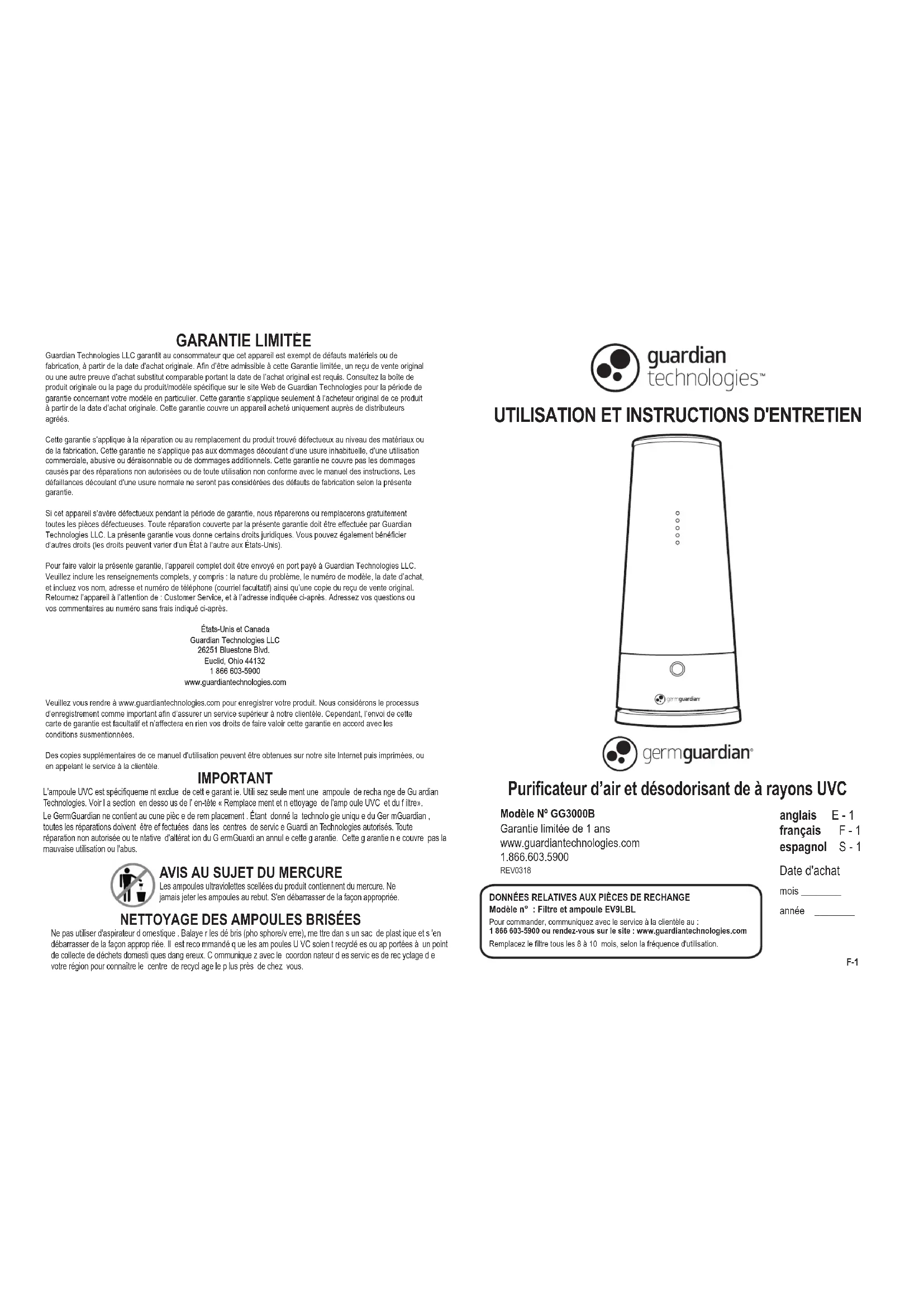 UNE MAUVAISE INSTALLATION OU UNE MAUVAISE UTILISATION DE L'AMPOULE UVC PEUT CAUSER DES BLESSURES AUX YEUX OU À LA PEAU. NE JAMAIS UTILISER L'AMPOULE SANS L'AVOIR INSTALLÉE DANS L'APPAREIL EN SUIVANT LES INSTRUCTIONS. NE JAMAIS FAIRE FONCTIONNER L'APPAREIL SANS LE CAPUCHON EN PLACE. Le seul entretien possible sur cet appareil est le remplacement de l'ampoule UVC. L'ampoule ne contient aucune pièce de rechange. Toutes les pieces, à l'exception de l'ampoule UVC, sont garanties 1 ans à partir de la date d'achat. Voir la garantie limitée. L'utilisation d'une ampoule autre que l'ampoule appropriée GermGuardian annule la garantie. Vous pouvez acheter les ampoules directement de Guardian Technologies LLC, ou nous pouvons vous fournir les noms des détaillants qui vendent nos produits.Les aspects médicaux associés à cet appareil et sa capacité de contribuer à la désinfection de l'air environnant n'ont pas été vérifiés par UL. L'achat d'un GermGuardian ne prévient pas la maladie. GermGuardian est conçu pour cibler et détruire 99,9% des germes en suspension dans l'air. GermGuardian est une marque enregistrée de Guardian Technologies LLC.S-1 Desinfectante de Aire y Desodorizante UV-C Inglés E - 1 Francés F - 1 Español S - 1 Fecha de compra mes ________año ________