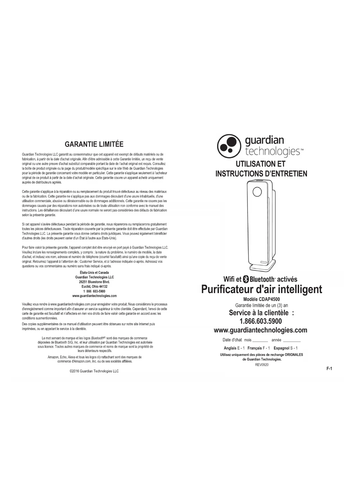 ©2016 Guardian Technologies LLCGuardian Technologies LLC garantit au consommateur que cet appareil est exempt de défauts matériels ou de fabrication, à partir de la date d'achat originale. Afin d’être admissible à cette Garantie limitée, un reçu de vente original ou une autre preuve d’achat substitut comparable portant la date de l’achat original est requis. Consultez la boîte de produit originale ou la page du produit/modèle spécifique sur le site Web de Guardian Technologies pour la période de garantie concernant votre modèle en particulier. Cette garantie s’applique seulement à l’acheteur original de ce produit à partir de la date d’achat originale. Cette garantie couvre un appareil acheté uniquement auprès de distributeurs agréés.Cette garantie s’applique à la réparation ou au remplacement du produit trouvé défectueux au niveau des matériaux ou de la fabrication. Cette garantie ne s’applique pas aux dommages découlant d’une usure inhabituelle, d’une utilisation commerciale, abusive ou déraisonnable ou de dommages additionnels. Cette garantie ne couvre pas les dommages causés par des réparations non autorisées ou de toute utilisation non conforme avec le manuel des instructions. Les défaillances découlant d’une usure normale ne seront pas considérées des défauts de fabrication selon la présente garantie.Si cet appareil s’avère défectueux pendant la période de garantie, nous réparerons ou remplacerons gratuitement toutes les pièces défectueuses. Toute réparation couverte par la présente garantie doit être effectuée par Guardian Technologies LLC. La présente garantie vous donne certains droits juridiques. Vous pouvez également bénéficier d’autres droits (les droits peuvent varier d’un État à l’autre aux États-Unis).Pour faire valoir la présente garantie, l’appareil complet doit être envoyé en port payé à Guardian Technologies LLC. Veuillez inclure les renseignements complets, y compris : la nature du problème, le numéro de modèle, la date d’achat, et incluez vos nom, adresse et numéro de téléphone (courriel facultatif) ainsi qu’une copie du reçu de vente original. Retournez l’appareil à l’attention de : Customer Service, et à l’adresse indiquée ci-après. Adressez vos questions ou vos commentaires au numéro sans frais indiqué ci-après. États-Unis et CanadaGuardian Technologies LLC26251 Bluestone Blvd.Euclid, Ohio 441321866603-5900www.guardiantechnologies.comVeuillez vous rendre à www.guardiantechnologies.com pour enregistrer votre produit. Nous considérons le processus d’enregistrement comme important afin d’assurer un service supérieur à notre clientèle. Cependant, l’envoi de cette carte de garantie est facultatif et n’affectera en rien vos droits de faire valoir cette garantie en accord avec les conditions susmentionnées.Des copies supplémentaires de ce manuel d'utilisation peuvent être obtenues sur notre site Internet puisimprimées, ou en appelant le service à la clientèle. UTILISATION ET