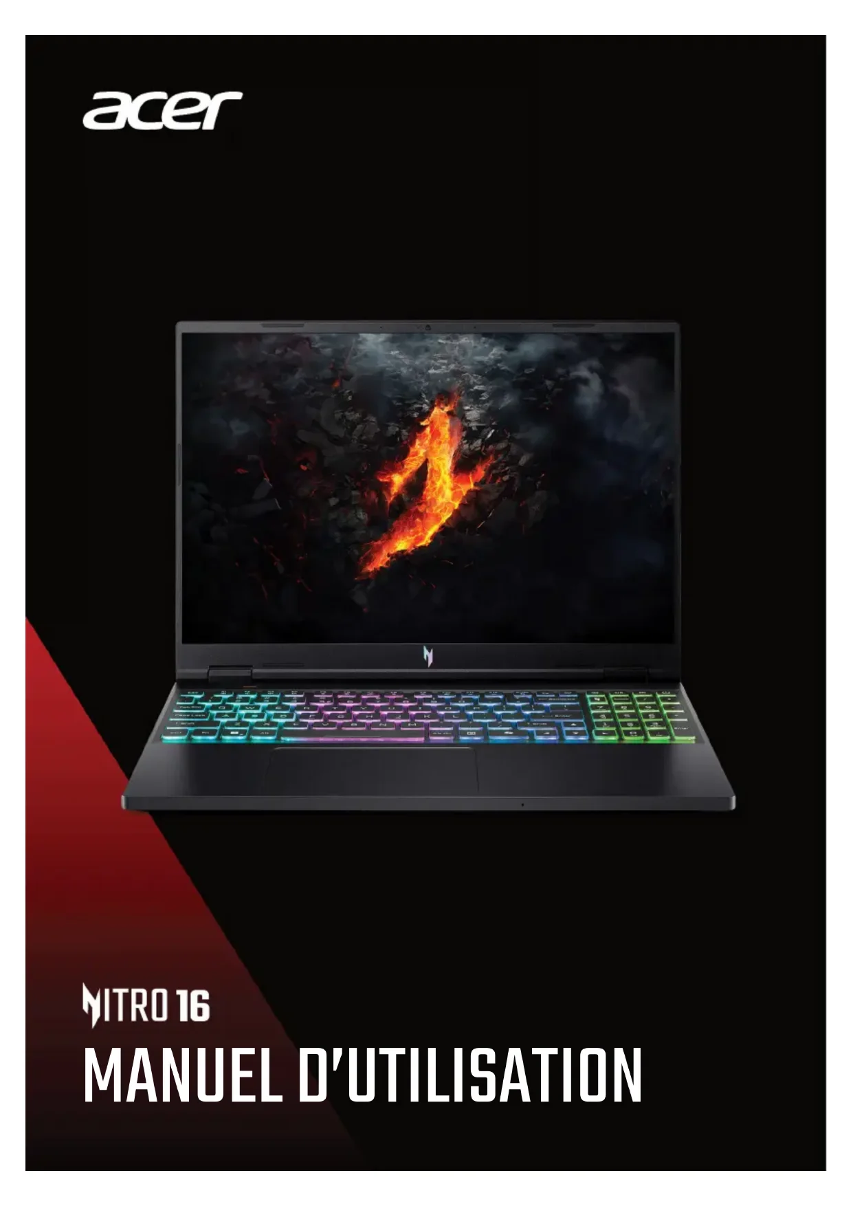 © 2024. Tous droits réservés. Nitro 16 Couvre : AN16-73 / AN16-43 Cette révision : 04/2024 Important Ce manuel contient des informations propriétaires qui sont protégées par les lois sur le copyright. Les informations contenues dans ce manuel peuvent être modifiées sans préavis. Certaines fonctionnalités décrites dans ce manuel peuvent ne pas être prises en charge en fonction de la version du système d’exploitation. Les images fournies ici sont pour référence seulement et peuvent contenir des informations ou des fonctionnalités qui ne s’appliquent pas à votre ordinateur. Le Groupe Acer ne peut être tenu responsable des erreurs ou omissions techniques ou éditoriales contenues dans ce manuel. Numéro de modèle : ___________________________________ Numéro de série : _____________________________________ Date d’achat : __________________________________________ Lieu d’achat : ___________________________________________ Les termes HDMI et High-Definition Multimedia Interface ainsi que le logo HDMI sont des marques commerciales ou des marques déposées de HDMI Licensing Administrator, Inc. aux États-Unis et dans d’autres pays.Table des matières - 3