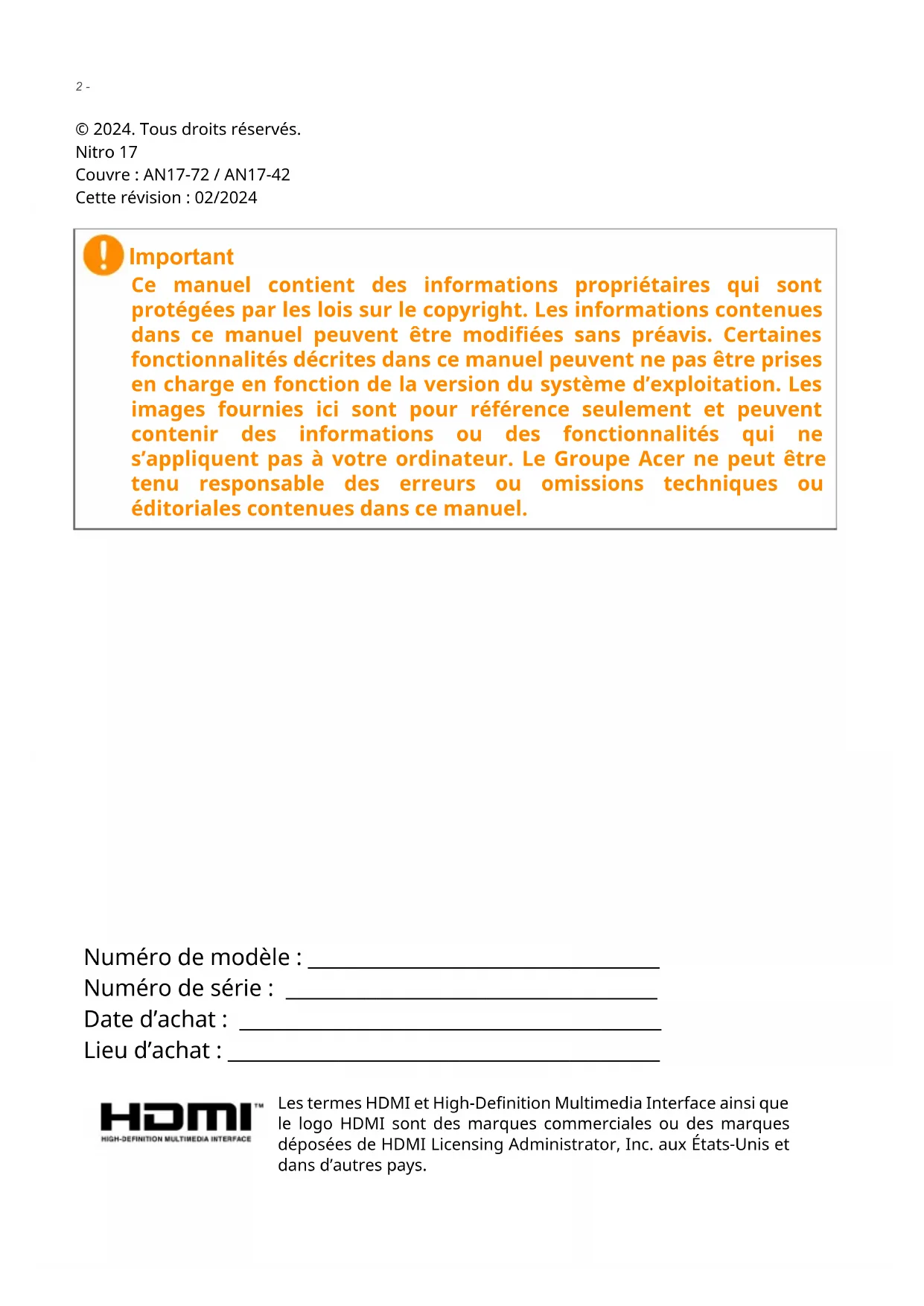 © 2024. Tous droits réservés. Nitro 17 Couvre : AN17-72 / AN17-42 Cette révision : 02/2024 Important Ce manuel contient des informations propriétaires qui sont protégées par les lois sur le copyright. Les informations contenues dans ce manuel peuvent être modifiées sans préavis. Certaines fonctionnalités décrites dans ce manuel peuvent ne pas être prises en charge en fonction de la version du système d’exploitation. Les images fournies ici sont pour référence seulement et peuvent contenir des informations ou des fonctionnalités qui ne s’appliquent pas à votre ordinateur. Le Groupe Acer ne peut être tenu responsable des erreurs ou omissions techniques ou éditoriales contenues dans ce manuel. Numéro de modèle : ___________________________________ Numéro de série : _____________________________________ Date d’achat : __________________________________________ Lieu d’achat : ___________________________________________ Les termes HDMI et High-Definition Multimedia Interface ainsi que le logo HDMI sont des marques commerciales ou des marques déposées de HDMI Licensing Administrator, Inc. aux États-Unis et dans d’autres pays.Table des matières - 3