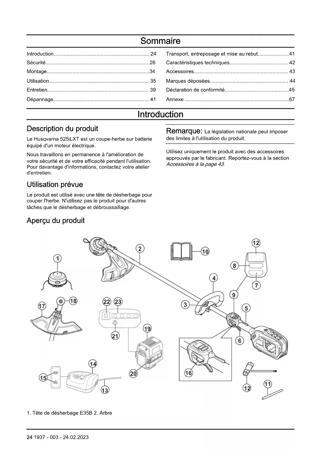 1937 - 003 - 24.02.2023 43Accessoires homologués Type d'accessoire Protection pour équipement de coupe, réf. Tête de désherbage E35B (fil de coupe Ø 2,4-Ø 2,7mm) 588 54 37-03 T35, T35x (fil de coupe Ø 2,4-Ø 2,7mm) 588 54 37-03 Lames à herbe 3T (Ø 255), kit de fixation poignée en J 538 90 87-01 4T (Ø 255), kit de fixation poignée en J 538 90 87-01 Marques déposées La marque et les logos Bluetooth