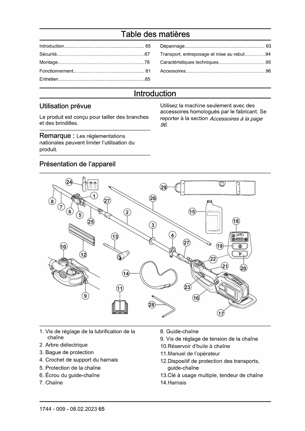 - Accessoires Introduction Utilisation prévue Le produit est conçu pour tailler des branches et des brindilles. Remarque: Les réglementations nationales peuvent limiter l’utilisation du produit. Utilisez la machine seulement avec des accessoires homologués par le fabricant. Se reporter à la section Accessoires à la page p. 96
