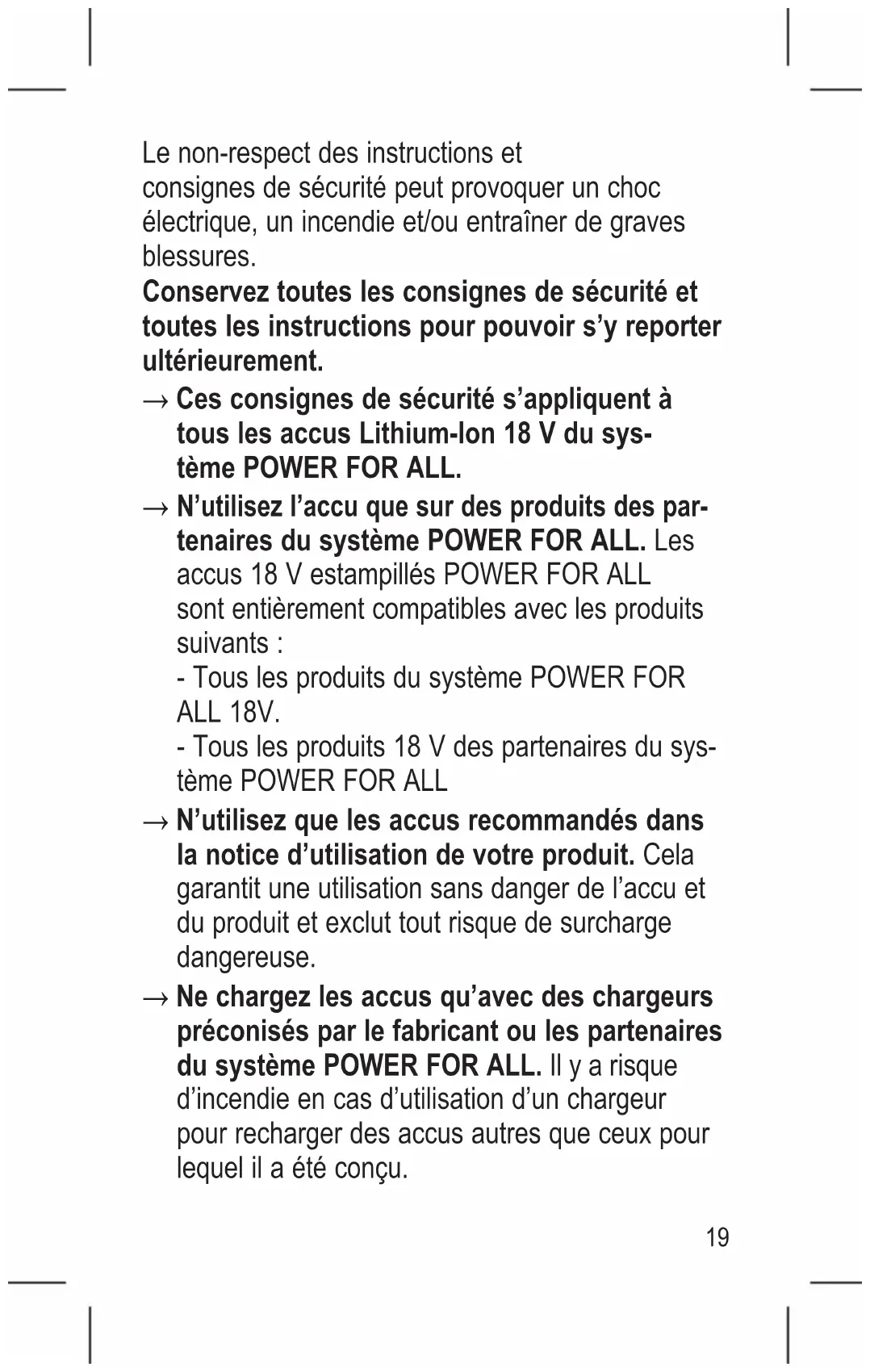 Ces consignes de sécurité s’appliquent à tous les accus Lithium-Ion 18 V du sys- tème POWER FOR ALL.