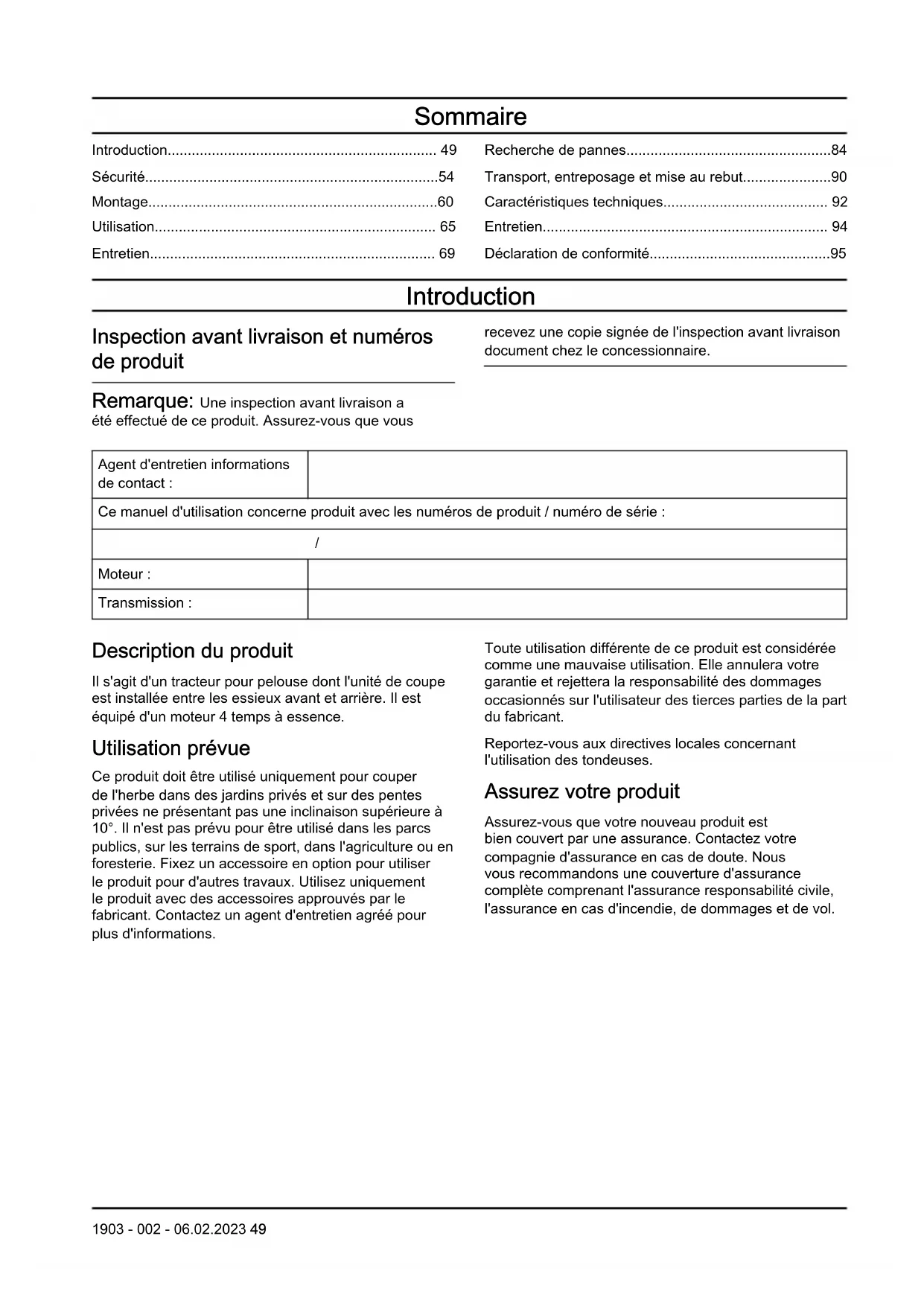Moteur : Transmission: Description du produit Il s'agit d'un tracteur pour pelouse dont l'unité de coupe est installée entre les essieux avant et arrière. Il est équipé d'un moteur 4temps à essence. Utilisation prévue Ce produit doit être utilisé uniquement pour couper de l'herbe dans des jardins privés et sur des pentes privées ne présentant pas une inclinaison supérieure à 10°. Il n'est pas prévu pour être utilisé dans les parcs publics, sur les terrains de sport, dans l'agriculture ou en foresterie. Fixez un accessoire en option pour utiliser le produit pour d'autres travaux. Utilisez uniquement le produit avec des accessoires approuvés par le fabricant. Contactez un agent d'entretien agréé pour plus d'informations. Toute utilisation différente de ce produit est considérée comme une mauvaise utilisation. Elle annulera votre garantie et rejettera la responsabilité des dommages occasionnés sur l'utilisateur des tierces parties de la part du fabricant. Reportez-vous aux directives locales concernant l'utilisation des tondeuses. Assurez votre produit Assurez-vous que votre nouveau produit est bien couvert par une assurance. Contactez votre compagnie d'assurance en cas de doute. Nous vous recommandons une couverture d'assurance complète comprenant l'assurance responsabilité civile, l'assurance en cas d'incendie, de dommages et de vol. 1903 - 002 - 06.02.2023 49Aperçu du produit Présentation du produit (TC 112)
