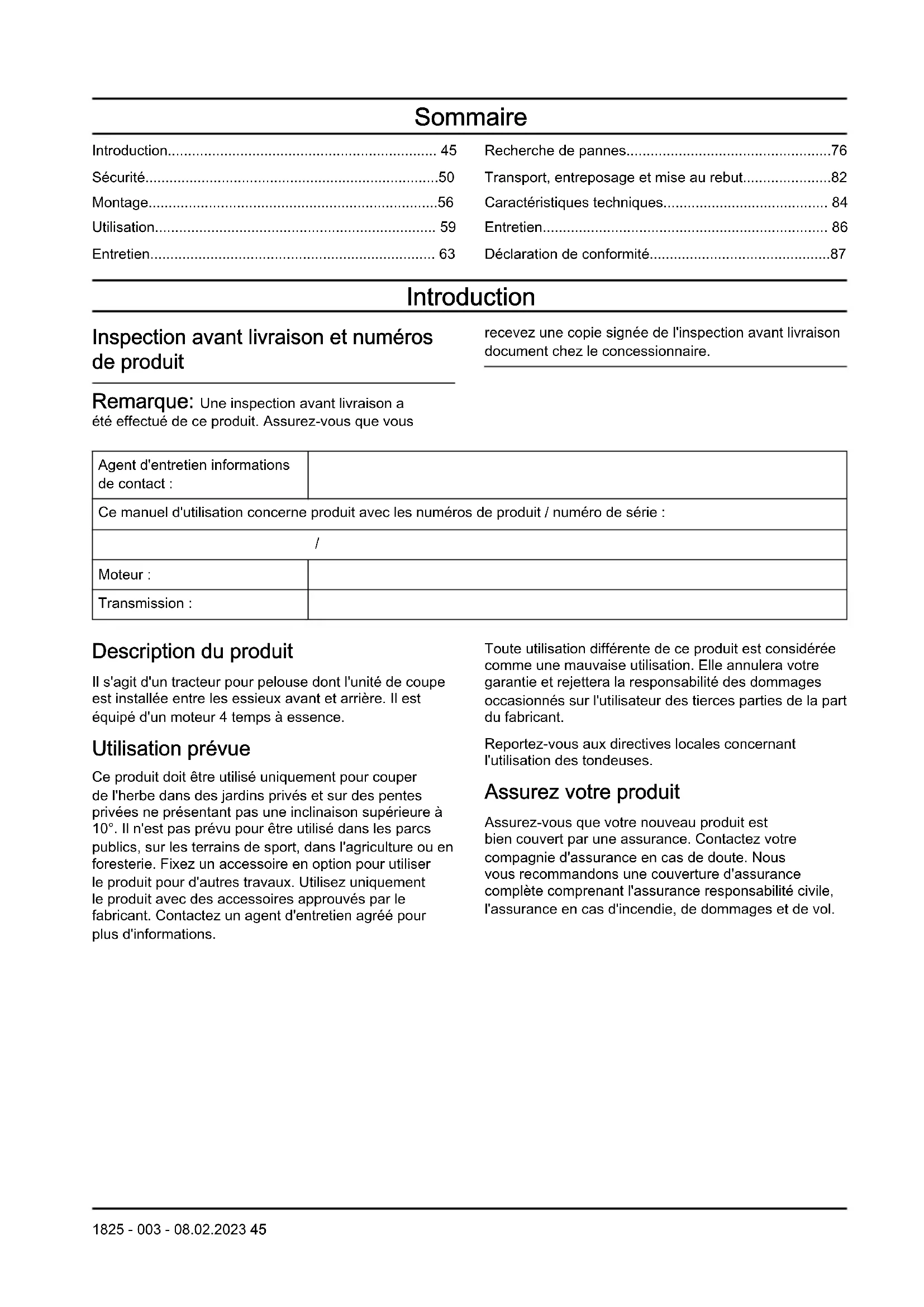 - Huskvarna, 30.01.2023 Claes Lossal, Entwicklungsleiter/Gartenprodukte, Husqvarna AB Verantwortlich für die technische Dokumentation 44 1825 - 003 - 08.02.2023Sommaire Introduction p. 45
