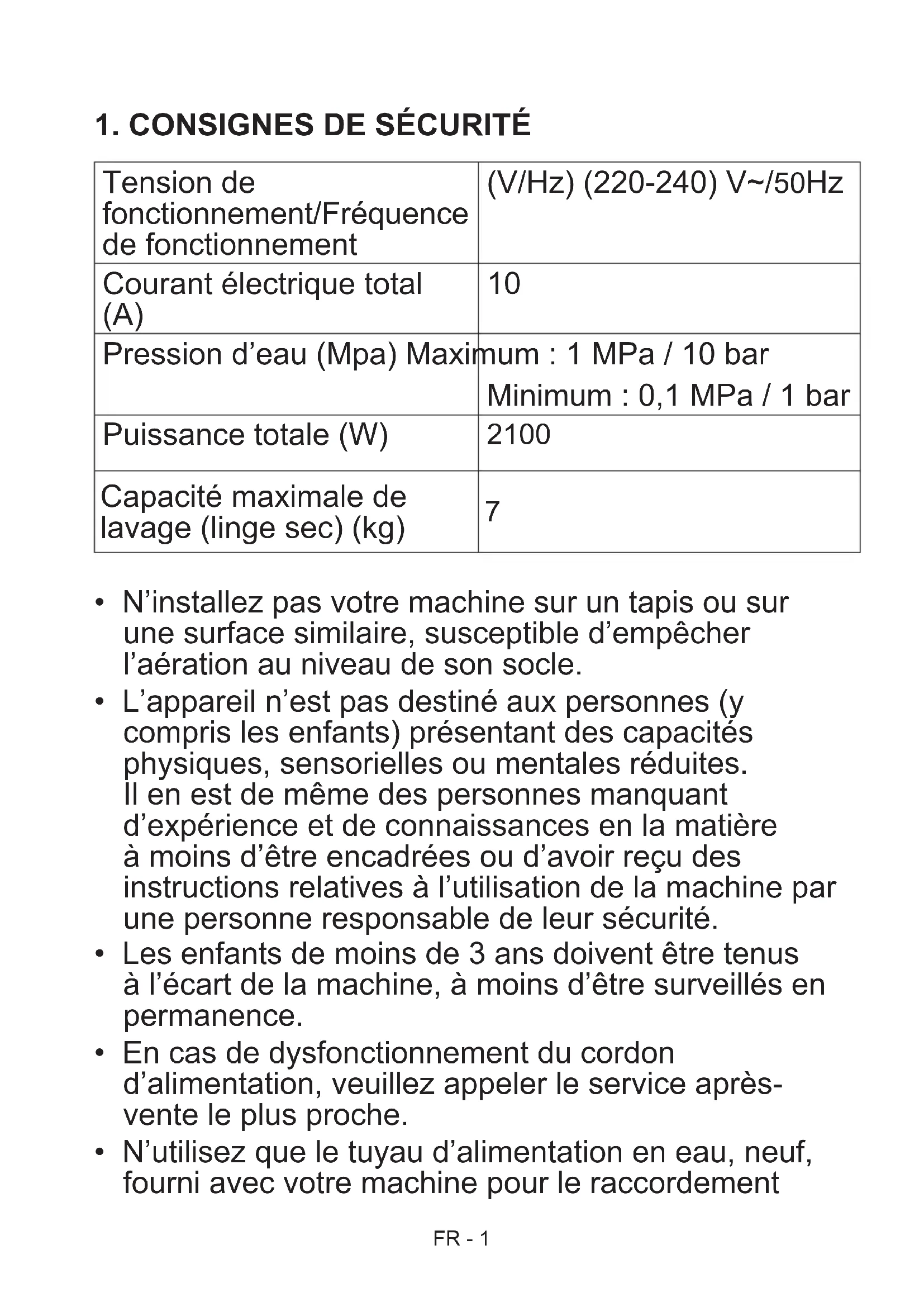 - L’appareil n’est pas destiné aux personnes (y compris les enfants) présentant des capacités physiques, sensorielles ou mentales réduites. Il en est de même des personnes manquant d’expérience et de connaissances en la matière à moins d’être encadrées ou d’avoir reçu des instructions relatives à l’utilisation de la machine par une personne responsable de leur sécurité.