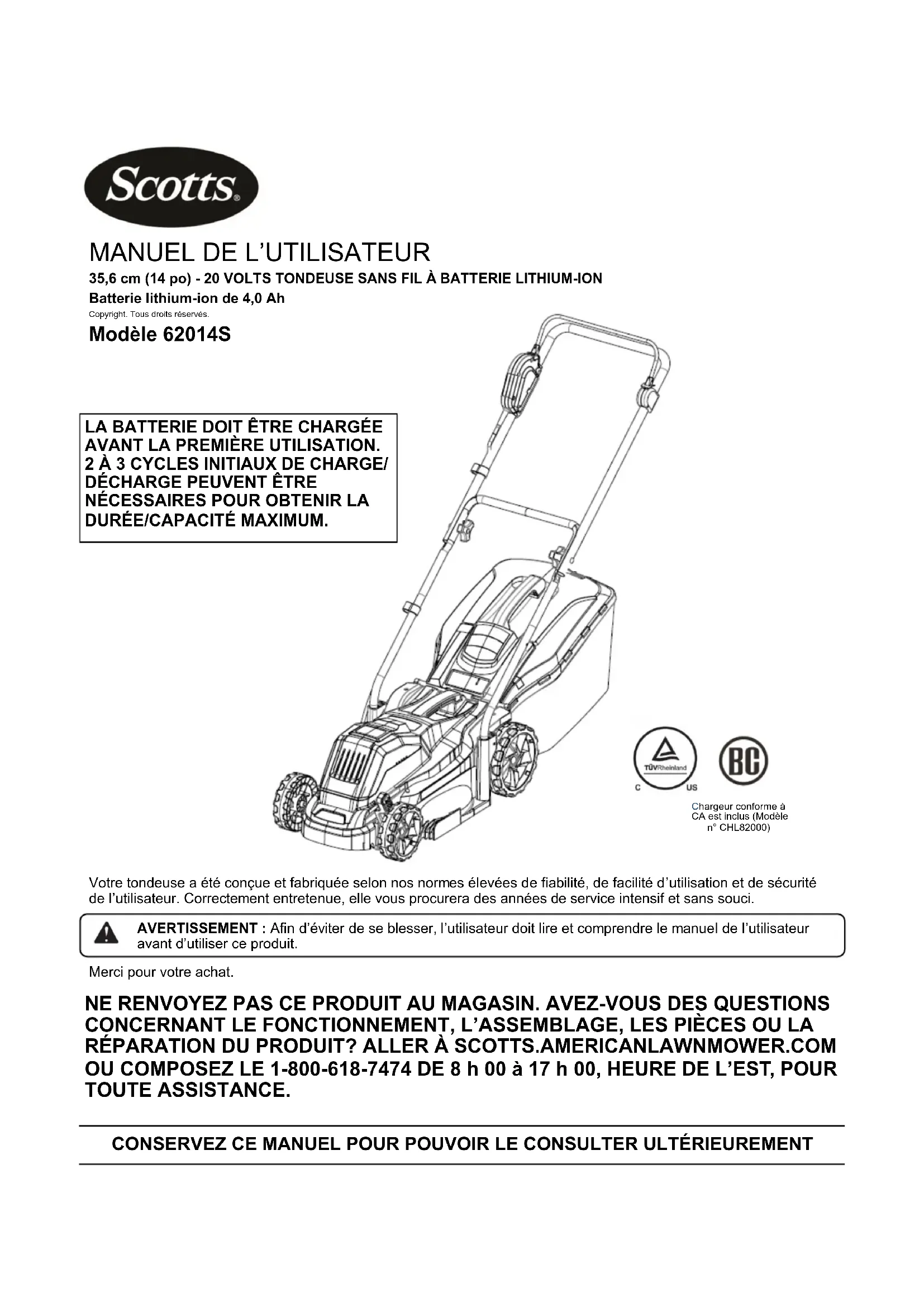35,6 cm (14 po) - 20 VOLTS TONDEUSE SANS FIL À BATTERIE LITHIUM-ION Batterie lithium-ion de 4,0 Ah Copyright. Tous droits réservés. Modèle 62014S GARANTIE Politique de garantie Scotts