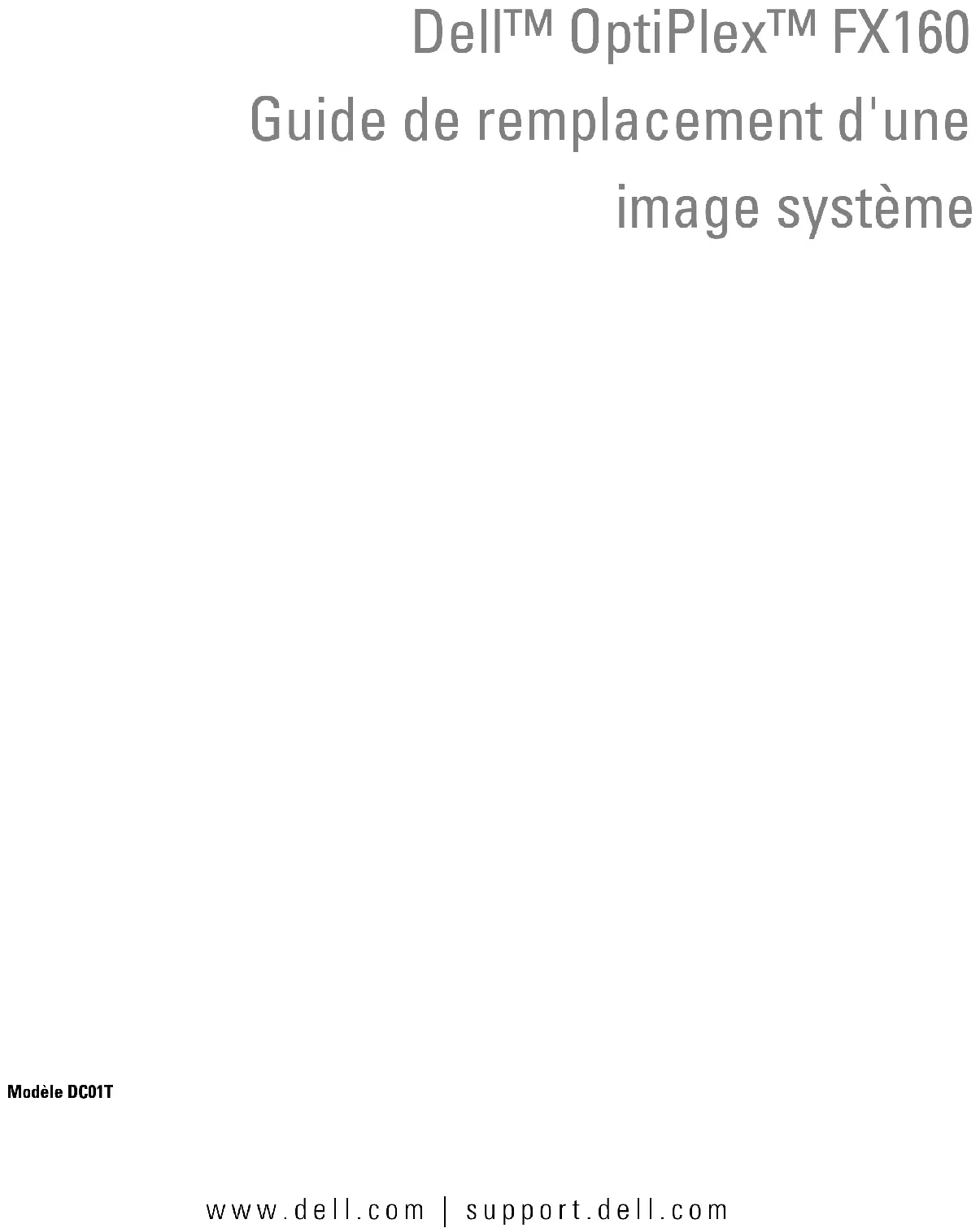 Les informations de ce document sont sujettes à modification sans préavis. © 2008 Dell Inc. Tous droits réservés. La reproduction de ce document de quelque manière que ce soit sans l'autorisation écrite de Dell Inc. est strictement interdite. Marques utilisées dans ce texte : Dell, le logo DELL et OptiPlex sont des marques de Dell Inc. ; Microsoft, Windows, Windows Vista et le logo du bouton Démarrer de Windows Vista sont des marques ou des marques déposées de Microsoft Corporation aux États-Unis et/ou dans d'autres pays. Les autres marques et noms de produits pouvant être utilisés dans ce document sont reconnus comme appartenant à leurs propriétaires respectifs. Dell Inc. rejette tout intérêt propriétaire dans les marques déposées et les noms de marques autres que les siens. Modèle DC01T Août 2008 RÉF H310K Rév. A01Guide de remplacement d'une image système - Dell™ OptiPlex™ FX160 47 Guide de remplacement d'une image système - Dell™ OptiPlex™ FX160 L'ordinateur Dell OptiPlex FX160 doté d'une carte flash/un disque dur interne est équipé d'un système d'exploitation Microsoft