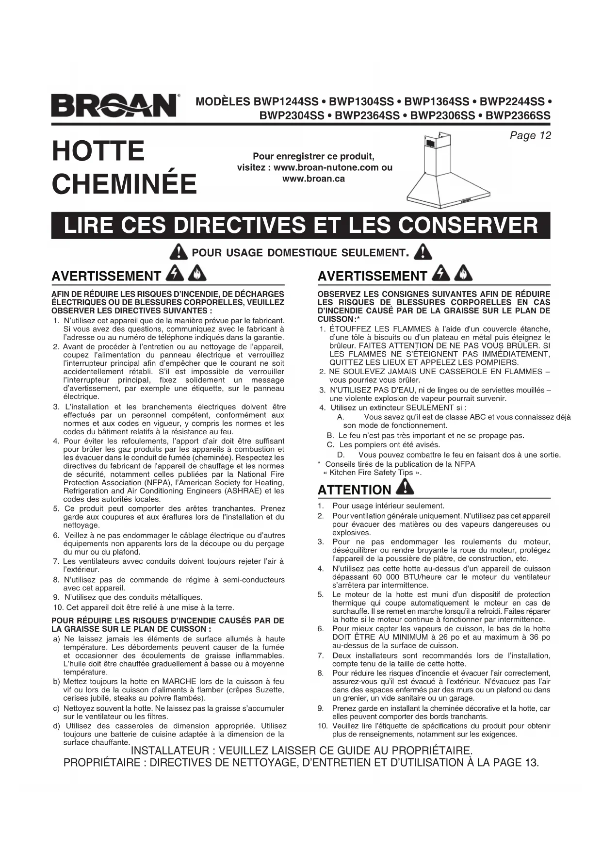 1. Pour usage intérieur seulement.2. Pour ventilation générale uniquement. N’utilisez pas cet appareil pour évacuer des matières ou des vapeurs dangereuses ou explosives.3. Pour ne pas endommager les roulements du moteur, déséquilibrer ou rendre bruyante la roue du moteur, protégez l’appareil de la poussière de plâtre, de construction, etc.4. N’utilisez pas cette hotte au-dessus d’un appareil de cuisson dépassant 60 000 BTU/heure car le moteur du ventilateur s’arrêtera par intermittence.5. Le moteur de la hotte est muni d’un dispositif de protection thermique qui coupe automatiquement le moteur en cas de surchauffe. Il se remet en marche lorsqu’il a refroidi. Faites réparer la hotte si le moteur continue à fonctionner par intermittence.6. Pour mieux capter les vapeurs de cuisson, le bas de la hotte DOIT ÊTRE AU MINIMUM à 26 po et au maximum à 36 po au-dessus de la surface de cuisson.7. Deux installateurs sont recommandés lors de l’installation, compte tenu de la taille de cette hotte.8. Pour réduire les risques d’incendie et évacuer l’air correctement, assurez-vous qu’il est évacué à l’extérieur. N’évacuez pas l’air dans des espaces enfermés par des murs ou un plafond ou dans un grenier, un vide sanitaire ou un garage.9. Prenez garde en installant la cheminée décorative et la hotte, car elles peuvent comporter des bords tranchants.10. Veuillez lire l’étiquette de spécifications du produit pour obtenir plus de renseignements, notamment sur les exigences.INSTALLATEUR : VEUILLEZ LAISSER CE GUIDE AU PROPRIÉTAIRE.PROPRIÉTAIRE : DIRECTIVES DE NETTOYAGE, D’ENTRETIEN ET D’UTILISATION À LA PAGE 13. AVERTISSEMENT Pour enregistrer ce produit,visitez : www.broan-nutone.com ouwww.broan.caPage 13 MODÈLES BWP1244SS • BWP1304SS • BWP1364SS • BWP2244SS • BWP2304SS • BWP2364SS • BWP2306SS • BWP2366SS