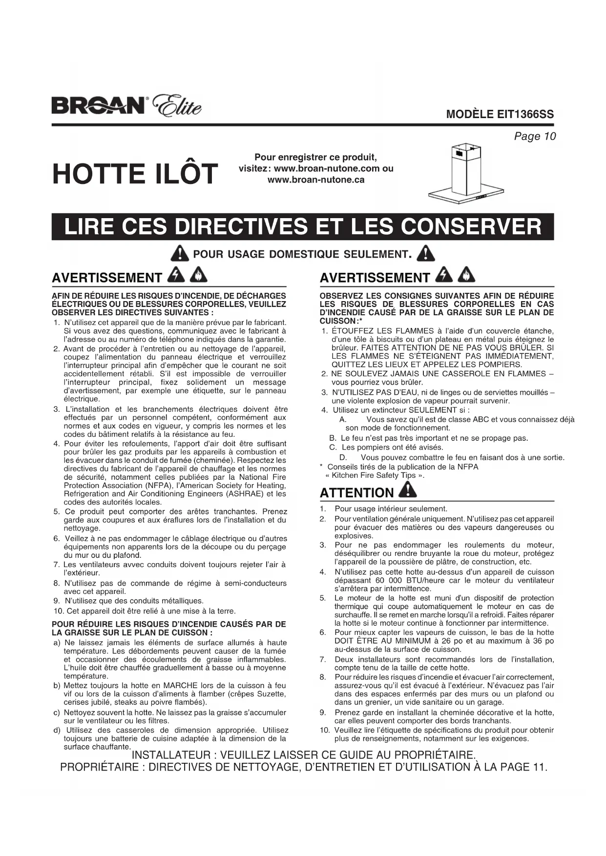 1. Pour usage intérieur seulement.2. Pour ventilation générale uniquement. N’utilisez pas cet appareil pour évacuer des matières ou des vapeurs dangereuses ou explosives.3. Pour ne pas endommager les roulements du moteur, déséquilibrer ou rendre bruyante la roue du moteur, protégez l’appareil de la poussière de plâtre, de construction, etc.4. N’utilisez pas cette hotte au-dessus d’un appareil de cuisson dépassant 60 000 BTU/heure car le moteur du ventilateur s’arrêtera par intermittence.5. Le moteur de la hotte est muni d’un dispositif de protection thermique qui coupe automatiquement le moteur en cas de surchauffe. Il se remet en marche lorsqu’il a refroidi. Faites réparer la hotte si le moteur continue à fonctionner par intermittence.6. Pour mieux capter les vapeurs de cuisson, le bas de la hotte DOIT ÊTRE AU MINIMUM à 26 po et au maximum à 36 po au-dessus de la surface de cuisson.7. Deux installateurs sont recommandés lors de l’installation, compte tenu de la taille de cette hotte.8. Pour réduire les risques d’incendie et évacuer l’air correctement, assurez-vous qu’il est évacué à l’extérieur. N’évacuez pas l’air dans des espaces enfermés par des murs ou un plafond ou dans un grenier, un vide sanitaire ou un garage.9. Prenez garde en installant la cheminée décorative et la hotte, car elles peuvent comporter des bords tranchants.10. Veuillez lire l’étiquette de spécifications du produit pour obtenir plus de renseignements, notamment sur les exigences.INSTALLATEUR : VEUILLEZ LAISSER CE GUIDE AU PROPRIÉTAIRE.PROPRIÉTAIRE : DIRECTIVES DE NETTOYAGE, D’ENTRETIEN ET D’UTILISATION À LA PAGE 11. AVERTISSEMENT Pour enregistrer ce produit, visitez : www.broan-nutone.com ouwww.broan-nutone.caPage 11