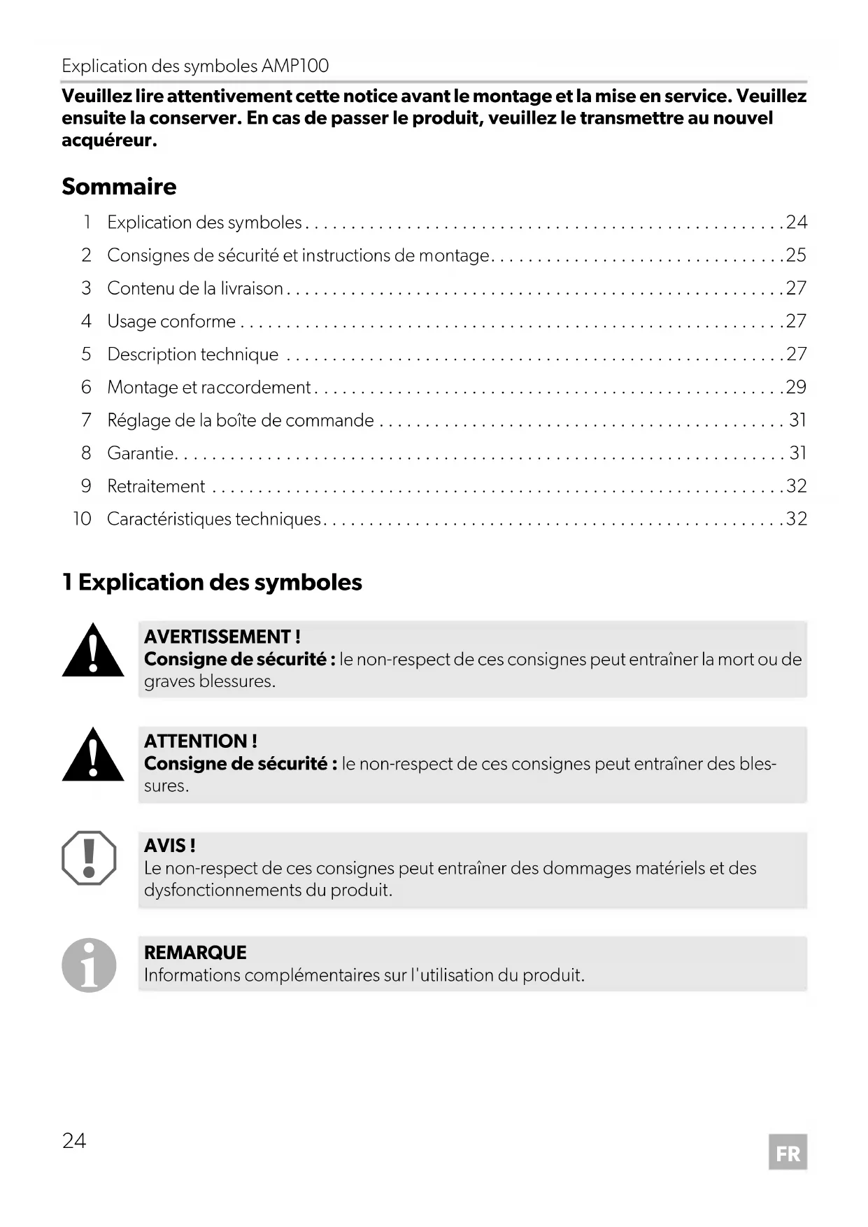 - Veuillez lire attentivement cette notice avant le montage et la mise en service. Veuillez ensuite la conserver. En cas de passer le produit, veuillez le transmettre au nouvel acquéreur. Sommaire 1 Explication des symboles p. 24