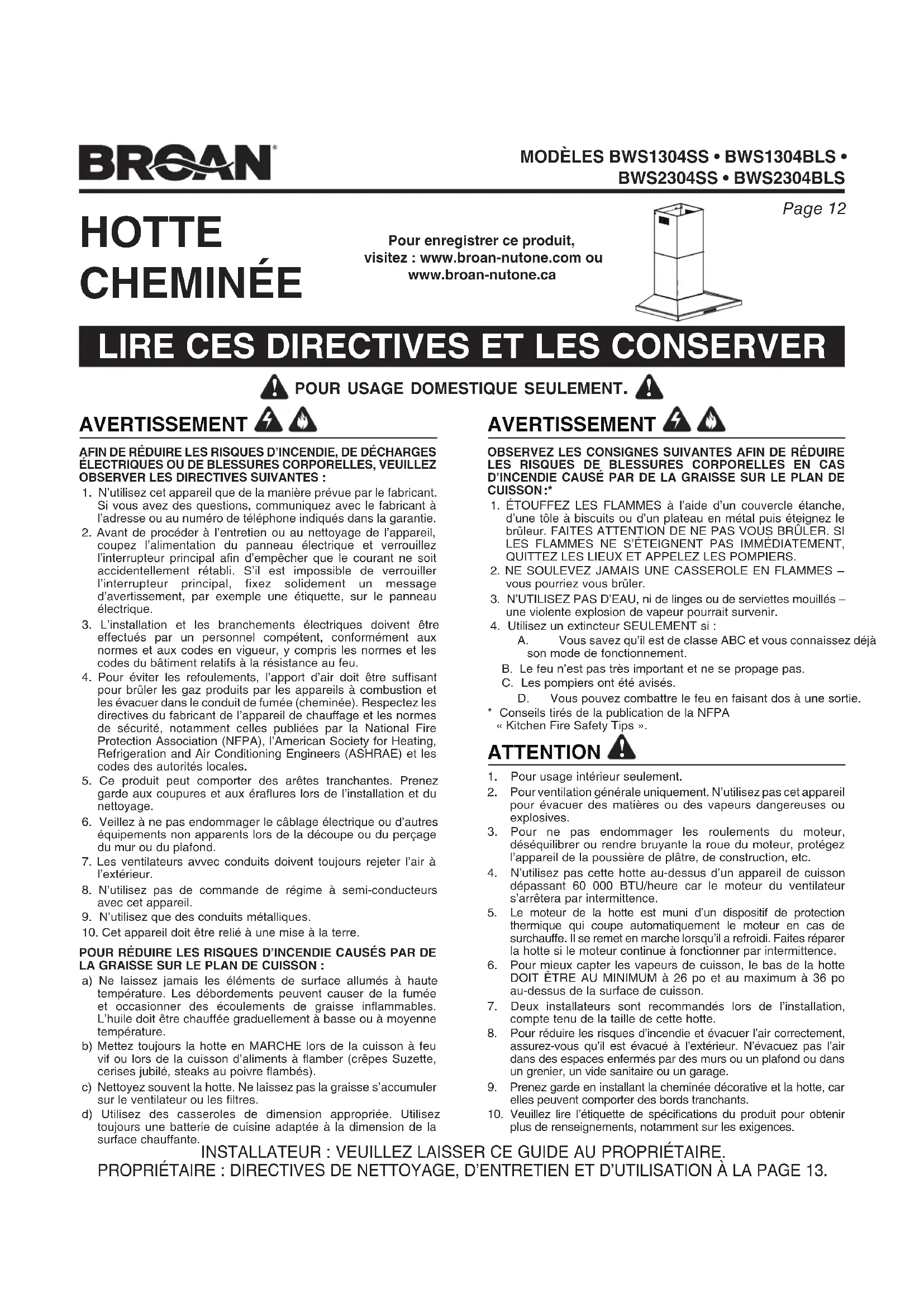1. Pour usage intérieur seulement.2. Pour ventilation générale uniquement. N’utilisez pas cet appareil pour évacuer des matières ou des vapeurs dangereuses ou explosives.3. Pour ne pas endommager les roulements du moteur, déséquilibrer ou rendre bruyante la roue du moteur, protégez l’appareil de la poussière de plâtre, de construction, etc.4. N’utilisez pas cette hotte au-dessus d’un appareil de cuisson dépassant 60 000 BTU/heure car le moteur du ventilateur s’arrêtera par intermittence.5. Le moteur de la hotte est muni d’un dispositif de protection thermique qui coupe automatiquement le moteur en cas de surchauffe. Il se remet en marche lorsqu’il a refroidi. Faites réparer la hotte si le moteur continue à fonctionner par intermittence.6. Pour mieux capter les vapeurs de cuisson, le bas de la hotte DOIT ÊTRE AU MINIMUM à 26 po et au maximum à 36 po au-dessus de la surface de cuisson.7. Deux installateurs sont recommandés lors de l’installation, compte tenu de la taille de cette hotte.8. Pour réduire les risques d’incendie et évacuer l’air correctement, assurez-vous qu’il est évacué à l’extérieur. N’évacuez pas l’air dans des espaces enfermés par des murs ou un plafond ou dans un grenier, un vide sanitaire ou un garage.9. Prenez garde en installant la cheminée décorative et la hotte, car elles peuvent comporter des bords tranchants.10. Veuillez lire l’étiquette de spécifications du produit pour obtenir plus de renseignements, notamment sur les exigences.INSTALLATEUR : VEUILLEZ LAISSER CE GUIDE AU PROPRIÉTAIRE.PROPRIÉTAIRE : DIRECTIVES DE NETTOYAGE, D’ENTRETIEN ET D’UTILISATION À LA PAGE 13. AVERTISSEMENT Pour enregistrer ce produit, visitez : www.broan-nutone.com ouwww.broan-nutone.caPage 13