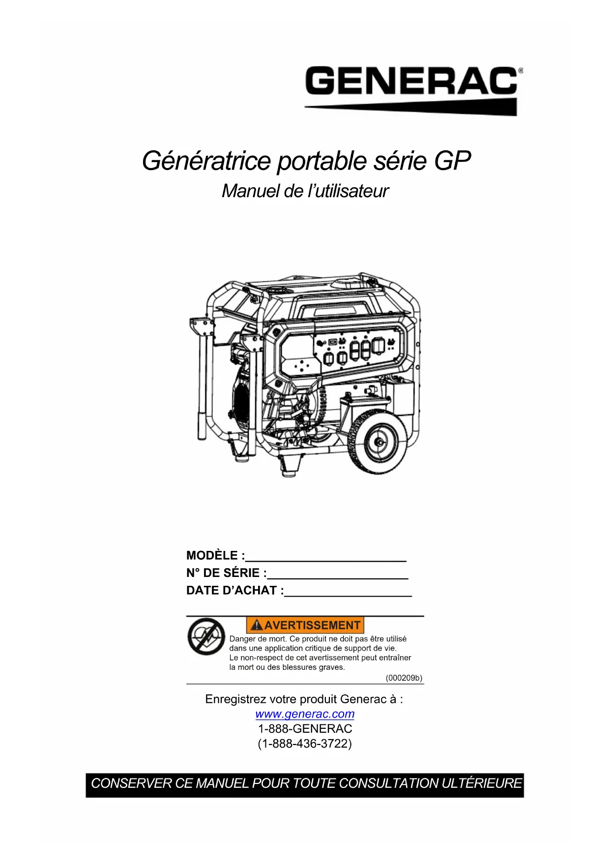 défaillance ou s’adresser à un IASD. PROBLÈME CAUSE CORRECTION26 Manuel de l’utilisateur de la génératrice portable Schéma de câblageManuel de l’utilisateur de la génératrice portable 27 Notes28 Manuel de l’utilisateur de la génératrice portable NotesRéf. A0000244500 Rév. A 03/10/2022 ©2022 Generac Power Systems, Inc. Tous droits réservés Les spécifications sont sujettes à modification sans préavis. Aucune forme de reproduction n’est autorisée sans le consentement écrit préalable de Generac Power Systems, Inc. Generac Power Systems, Inc. S45 W29290 Hwy. 59 Waukesha, WI 53189 1-888-GENERAC (1-888-436-3722) www.generac.com