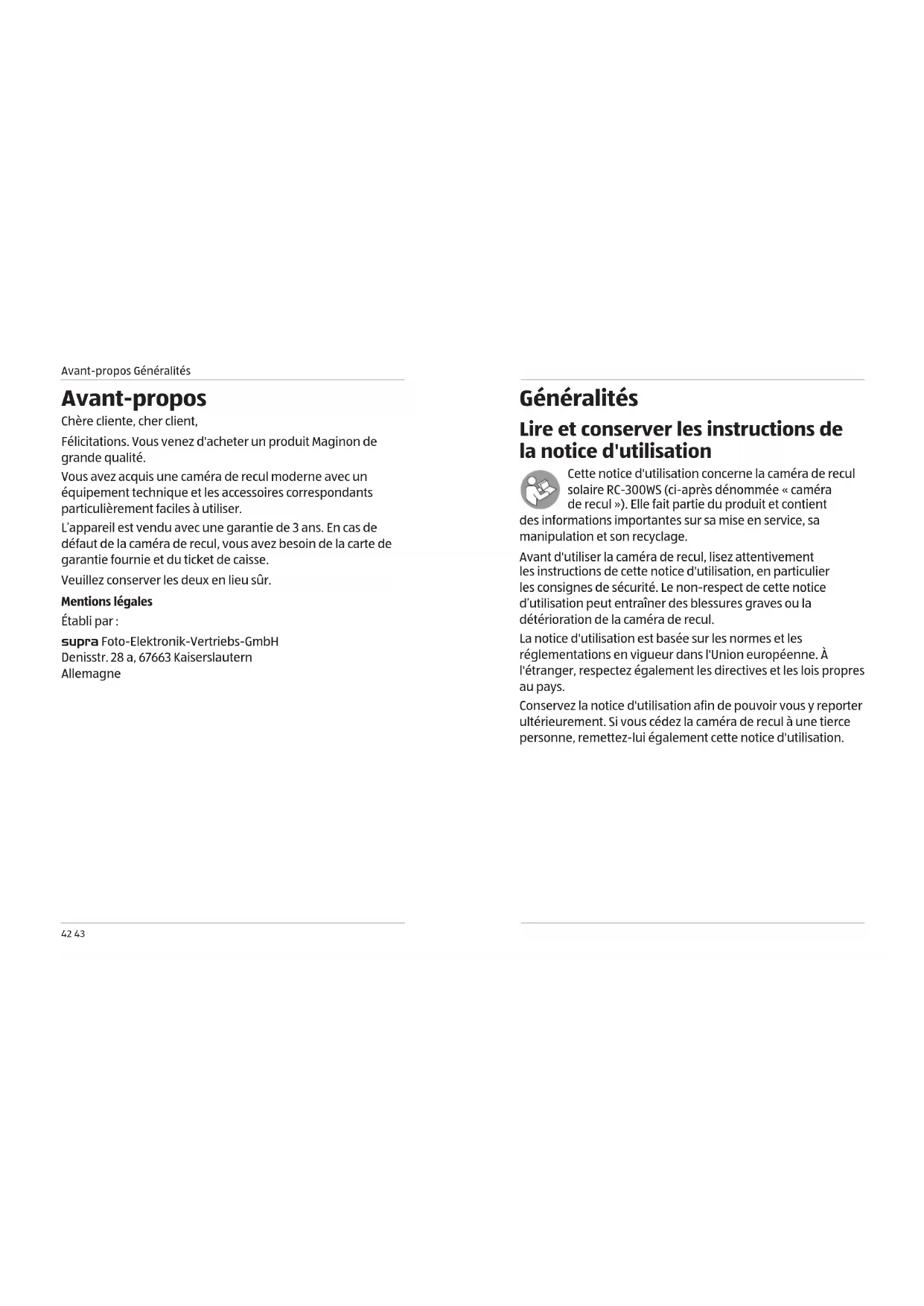 - L’appairage manuel ne fonctionne que dans la portée du signal de la connexion 2,4 GHz (17,5 m). Données techniques Modèle: RC-300WS Caméra de recul Définition vidéo: 640px 480p Alimentation en énergie: batterie Li-Polymère de 3,7V 2100mAh Indice de protection IP: IP67 (seulement le support de plaque d'immatriculation avec caméra et panneau solaire) Angle de vue: 135° Entrée: 5V 2A Transmetteur Gamme de fréquences: 2402-2483.5 MHz Puissance d’émission maximale : 19 dBm Portée du signal: env. 17,5mPremière mise en service Informations sur la déclaration UE de conformité Température de fonctionnement: de −10°C à +60°C Moniteur Diagonale d'écran: 4,3" (10,9cm) Définition de l'afficheur 480px 272p Alimentation en énergie: 5V 450mA Adaptateur allume-cigare Entrée: 12/24V Sortie: 5V 2A Sortie USB: 5V 2A Fusible: F3AL250V 5x 20mm La conception et les données techniques peuvent être modifiées sans préavis. Informations sur la déclaration UE de conformité Par la présente, supra Foto-Elektronik-Vertriebs-GmbH déclare que le type d'équipement radioélectrique «RC- 300WS» est conforme à la directive 2014/53/UE. Le texte complet de la déclaration UE de conformité est disponible à l'adresse Internet suivante: https://downloads.maginon.de/en/ downloads/conformity/ supra Foto-Elektronik-Vertriebs GmbH Denisstr. 28 a, 67663 Kaiserslautern, Allemagne Rangement − Si la caméra de recul et ses accessoires ne sont pas utilisés sur une longue période, ils doivent être débranchés de l'alimentation électrique et rangés dans un endroit propre et sec, hors de la portée des enfants. − En cas de transport et pour éviter tout dommage durant le trajet, rangez la caméra de recul dans son emballage d'origine. Nettoyage REMARQUE! Risque de court-circuit! La présence d'eau dans le boîtier est susceptible de provoquerNettoyage Recyclage72 73 un court-circuit. − Ne plongez jamais la caméra de recul ou les accessoires dans l'eau. − Assurez-vous que de l'eau ne pénètre pas à l'intérieur du boîtier. REMARQUE! Risque de dommages matériels! Une manipulation non conforme de la caméra de recul peut provoquer des dommages. − N'utilisez pas de produits de nettoyage/solvants agressifs, de brosses à poils métalliques ou en nylon, ni d'objets de nettoyage tranchants ou métalliques tels que des couteaux, des raclettes rigides, etc. Ceux-ci sont susceptibles d’endommager la surface. − Ne mettez jamais la caméra de recul au lave-vaisselle. La caméra de recul subirait alors des dommages irrémédiables.