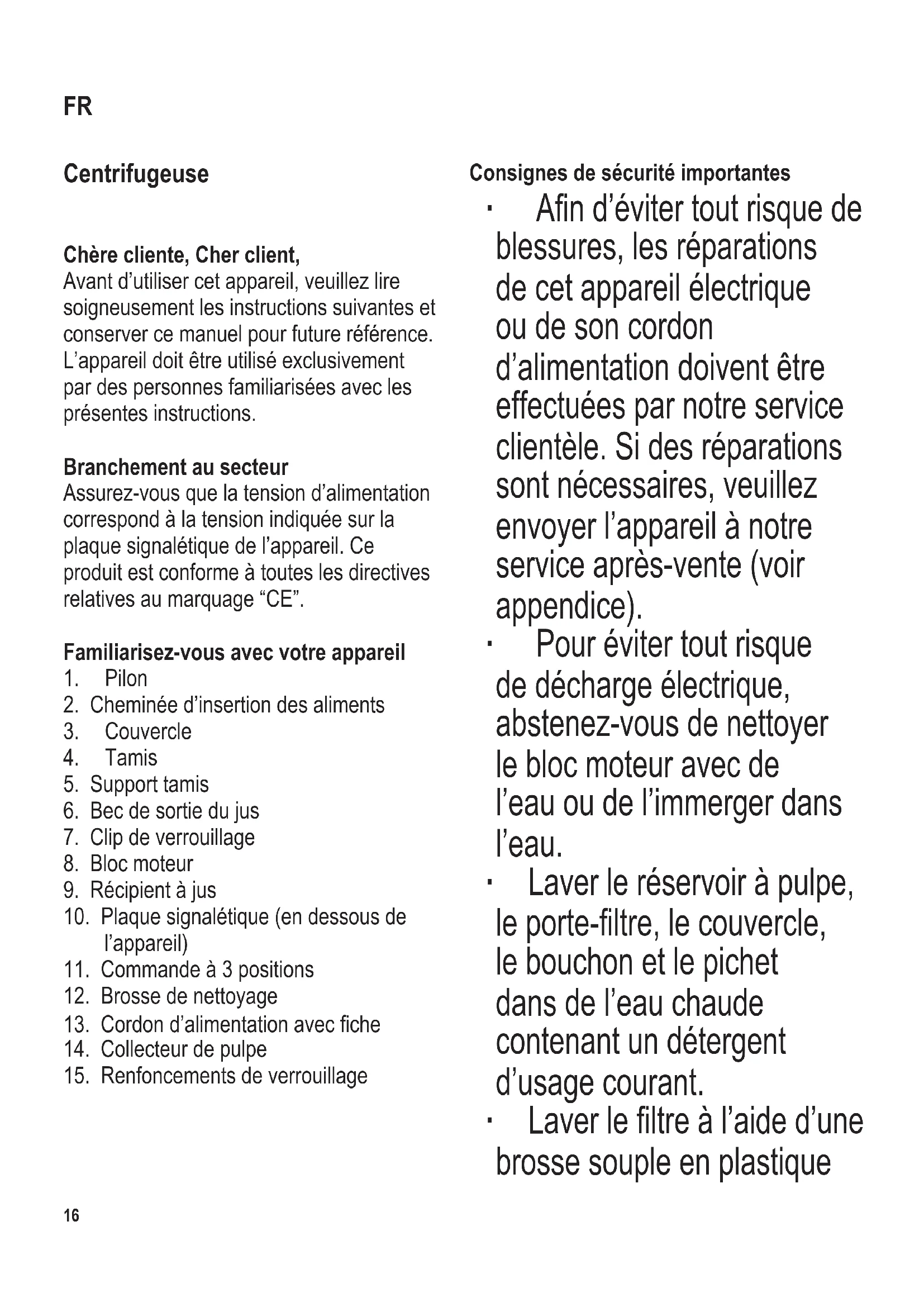 Entretien et nettoyage ∙ Avant de nettoyer l’appareil, débranchez toujours la che de la prise de courant et laissez l’appareil refroidir sufsamment. ∙ Attention : Le tamis présente des petites pointes acérées qui présentent un risque de blessures. ∙ N’utilisez aucune solution abrasive, détergent concentré ou brosse dure pour nettoyer l’appareil. ∙ Pour éviter tout risque de décharge électrique, abstenez-vous de nettoyer le bloc moteur avec de l’eau ou de l’immerger dans l’eau. ∙ Le bloc moteur pourra être nettoyé avec un chiffon humide non pelucheux. ∙ Le collecteur de pulpe, le support tamis, le couvercle, le pilon et le récipient à jus peuvent tous être nettoyés à l’eau chaude additionnée de détergent doux. ∙ Le tamis doit être nettoyé à l’aide d’une brosse douce en nylon disponible dans le commerce. Ne pas nettoyer le tamis avec un objet dur car ceci pourrait le rendre inutilisable. ∙ Ces accessoires ne peuvent pas être lavés au lave-vaisselle. Mise au rebut Les appareils qui portent ce symbole doivent être collectés et traités séparément de vos déchets ménagers, car ils contiennent des matériaux précieux qui peuvent être recyclés. En vous débarrassant correctement de ces appareils, vous contribuez à la prévention de potentiels effets négatifs sur la santé humaine et l’environnement. Votre mairie ou le magasin auprès duquel vous avez acquis l’appareil peuvent vous donner des informations à ce sujet. Garantie Cet appareil est garanti par le fabricant pendant une durée de deux ans à partir de la date d‘achat, contre tous défauts de matière et vices de fabrication. Au cours de cette période, toute pièce défectueuse sera remplacée gratuitement. Cette garantie ne couvre pas l‘usure normale de l‘appareil, les pièces cassables telles que du verre, des ampoules, etc., ni les détériorations provoquées par une mauvaise utilisation et le non-respect du mode d‘emploi. Aucune garantie ne sera due si l‘appareil a fait l‘objet d‘une intervention à titre de réparation ou d‘entretien par des personnes non-agréées par nous-mêmes. Cette garantie n‘affecte pas les droits légaux des consommateurs sous les lois nationales applicables en vigueur, ni les droits du consommateur face au revendeur résultant du contrat de vente/d‘achat. Si votre appareil ne fonctionne plus normalement, veuillez l‘adresser, sous emballage solide, à une de nos stations de service après-vente agréées, muni de votre nom et adresse. Si vous retournez votre appareil pendant la période de garantie, n‘oubliez pas de joindre à votre envoi la preuve de garantie (ticket de caisse, facture etc.) certiée par le vendeur.22 104 x 142 mm Sapcentrifuge Geachte klant, Voordat het apparaat gebruikt wordt, de volgende instructies goed doorlezen en deze handleiding bewaren voor toekomstige raadpleging. Dit apparaat mag alleen gebruikt worden door personen die bekend zijn met de gebruiksaanwijzing. Aansluiting Zorg ervoor dat de op het typeplaatje aangegeven spanning overeenkomt met de netspanning. Dit product komt overeen met de richtlijnen aangegeven op het CE-label. Beschrijving