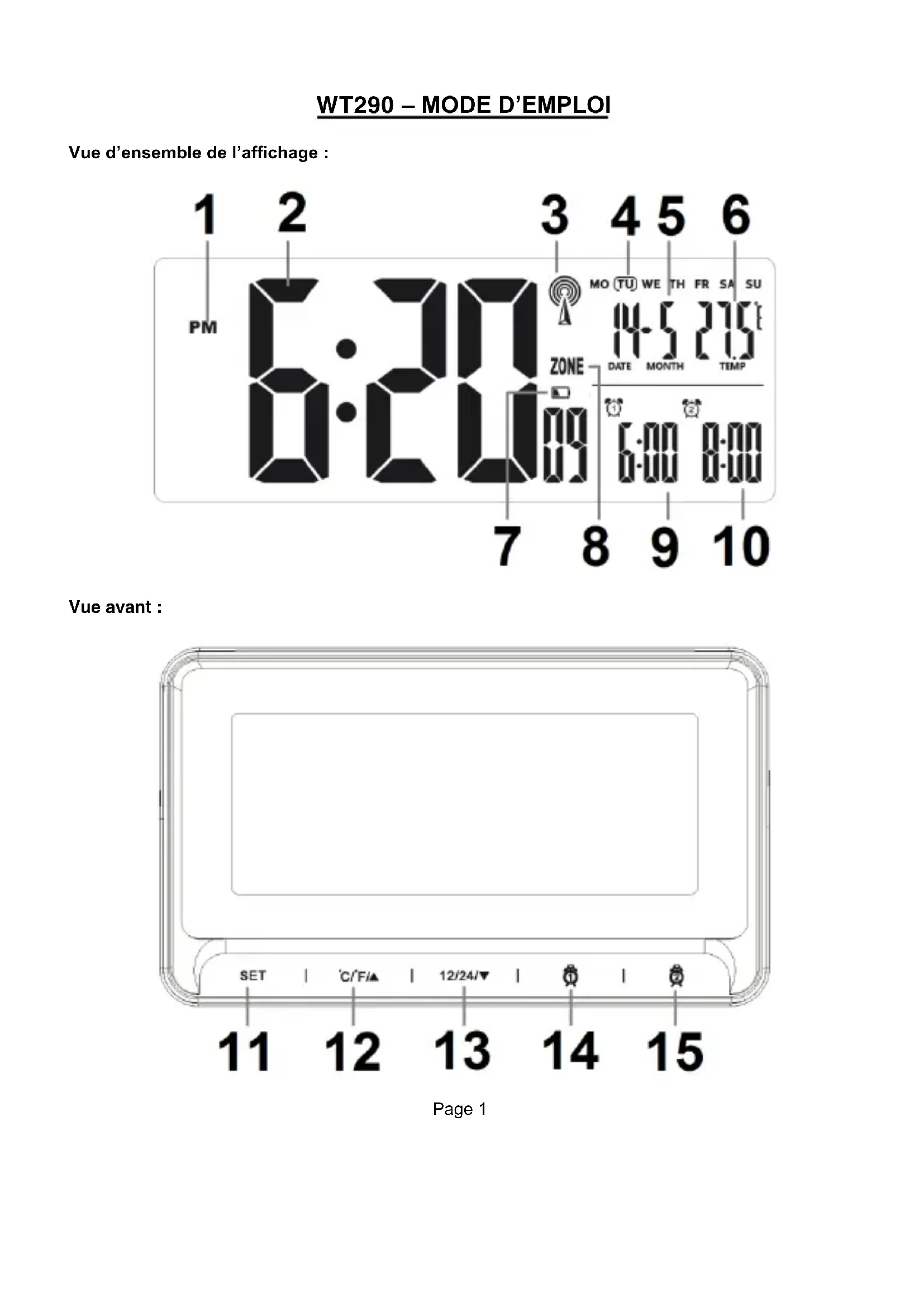 Le réglage reviendra automatiquement au mode d’affichage de l’heure, si aucune touche n’estPage 6 enfoncée pendant 30 secondes.