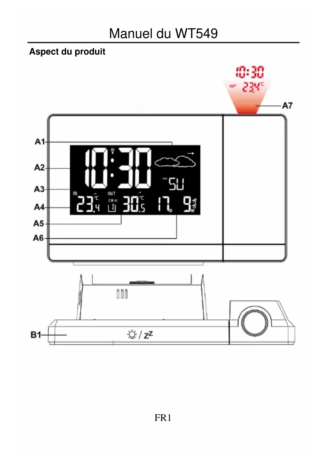 Partie A-Afficheur LCD positif A1: Prévision météorologique A2 : Heure A3 : Semaine A4 : Température intérieure A5 : Température extérieure A6 : Calendrier A7 : Écran de projection Partie B – touches de la face arrière B1 : Touche de « Rappel d’alarme/Éclairage »FR3 B2 : Touche « Arc-en-ciel » B3 : Interrupteur d’activation/de désactivation de l’alarme 1 B4 : Touche « Mode/Réglage » B5 : Touche « Mém/Alarme » B6 : Touche « Boucle » B7 : Touche « +/can. » B8 : Touche « -/éclairage » B9 : Interrupteur d’activation/de désactivation de l’alarme 2 B10 : Prise d’alimentation électrique B11 : Compartiment à piles Caractéristiques : Horloge radio pilotée DCF-77 Format de l’heure 12/24 heures Réglage du fuseau horaire (-1/+2 h) Réglage manuel de l’heure Projection de l’heure Affichage de la date et du jour de semaine (7 langues) Affichage de la température alternativement en °C et °F Alarme et rappel de l’alarme Plage de température intérieure : -9,9°C ~ 49,9°C Alimentation électrique : Adaptateur secteurFR4 HX075-0500600-AG (inclus), 2 piles « AAA » 1,5 V LR03 (non incluses) Première utilisation Branchez l’adaptateur secteur fourni dans la prise située à l’arrière Vous pouvez également utiliser des piles. Ouvrez le compartiment à piles. Insérez 2 piles AAA en respectant les polarités [marques «+» et «-»]. Lorsque vous insérez les piles, toutes les icônes de l’écran LCD s’allument pendant 3 secondes, un bip sera émis et l’horloge détecte la température intérieure. Ensuite, l’horloge passe en mode réception du signal horaire radio-piloté. Projection : La projection continue n’est possible qu’en utilisant l'adaptateur secteur Lorsque vous alimentez avec l’adaptateur CC, appuyer sur la touche « - » vous permet de choisir parmi forte luminosité/faible luminosité/pas de rétroéclairage. La projectionFR5 ne cesse jamais de fonctionner. Appuyez sur la touche " " et maintenez-la enfoncée pour faire pivoter la projection de 180°. Rétroéclairage et Projection Mode pile Touchez une fois la touche « SNOOZE/LIGHT » pour activer le rétroéclairage et la projection pendant 8 secondes (l’interrupteur de la projection est sur la position « ON ») Mode adaptateur CC Lorsque vous alimentez avec l’adaptateur CC, appuyer sur la touche « - » vous permet de choisir parmi forte luminosité élevée/faible luminosité/pas de rétroéclairage. La projection ne cesse jamais de fonctionner.FR6