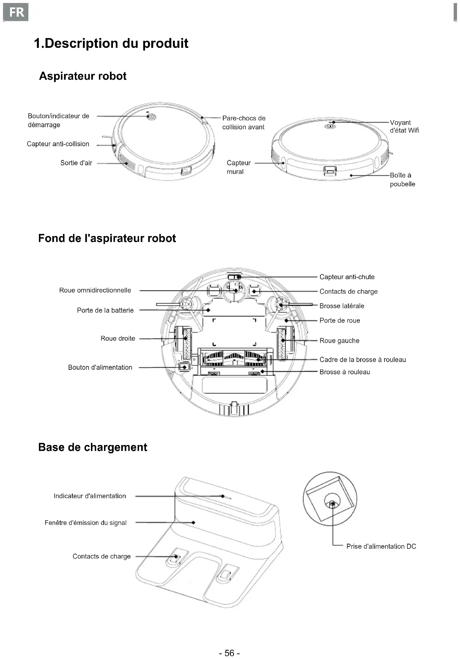 OFF Roue omnidirectionnellePorte de la batterieRoue droiteBouton d'alimentationCapteur anti-chuteContacts de chargeBrosse latéralePorte de roueRoue gauche Cadre de la brosse à rouleauBrosse à rouleau Base de chargement Indicateur d'alimentationFenêtre d'émission du signalContacts de chargePrise d'alimentation DC 1.Description du produit Aspirateur robot Voyant d'état Wifi- 57-