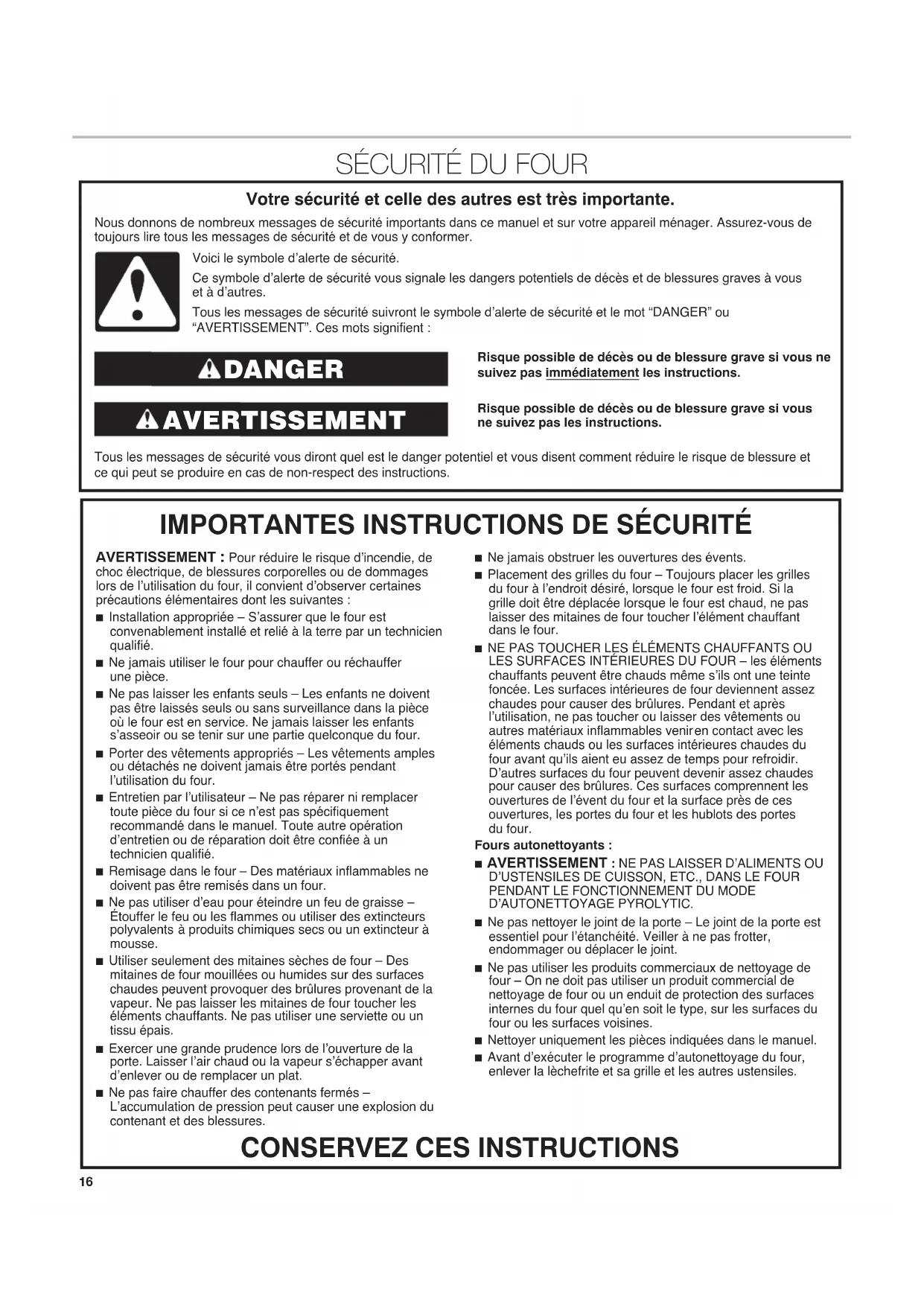 AVERTISSEMENT : Pour réduire le risque d’incendie, de choc électrique, de blessures corporelles ou de dommages lors de l’utilisation du four, il convient d’observer certaines précautions élémentaires dont les suivantes :n Installation appropriée – S’assurer que le four est convenablement installé et relié à la terre par un technicien qualifié.n Ne jamais utiliser le four pour chauffer ou réchauffer une pièce.n Ne pas laisser les enfants seuls – Les enfants ne doivent pas être laissés seuls ou sans surveillance dans la pièce où le four est en service. Ne jamais laisser les enfants s’asseoir ou se tenir sur une partie quelconque du four.n Porter des vêtements appropriés – Les vêtements amples ou détachés ne doivent jamais être portés pendant l’utilisation du four.n Entretien par l’utilisateur – Ne pas réparer ni remplacer toute pièce du four si ce n’est pas spécifiquement recommandé dans le manuel. Toute autre opération d’entretien ou de réparation doit être confiée à un technicien qualifié.n Remisage dans le four – Des matériaux inflammables ne doivent pas être remisés dans un four.n Ne pas utiliser d’eau pour éteindre un feu de graisse – Étouffer le feu ou les flammes ou utiliser des extincteurs polyvalents à produits chimiques secs ou un extincteur à mousse.n Utiliser seulement des mitaines sèches de four – Des mitaines de four mouillées ou humides sur des surfaces chaudes peuvent provoquer des brûlures provenant de la vapeur. Ne pas laisser les mitaines de four toucher les éléments chauffants. Ne pas utiliser une serviette ou un tissu épais.n Exercer une grande prudence lors de l’ouverture de la porte. Laisser l’air chaud ou la vapeur s’échapper avant d’enlever ou de remplacer un plat.n Ne pas faire chauffer des contenants fermés – L’accumulation de pression peut causer une explosion du contenant et des blessures.n Ne jamais obstruer les ouvertures des évents.n Placement des grilles du four – Toujours placer les grilles du four à l’endroit désiré, lorsque le four est froid. Si la grille doit être déplacée lorsque le four est chaud, ne pas laisser des mitaines de four toucher l’élément chauffant dans le four.n NE PAS TOUCHER LES ÉLÉMENTS CHAUFFANTS OU LES SURFACES INTÉRIEURES DU FOUR – les éléments chauffants peuvent être chauds même s’ils ont une teinte foncée. Les surfaces intérieures de four deviennent assez chaudes pour causer des brûlures. Pendant et après l’utilisation, ne pas toucher ou laisser des vêtements ou autres matériaux inflammables venir en contact avec les éléments chauds ou les surfaces intérieures chaudes du four avant qu’ils aient eu assez de temps pour refroidir. D’autres surfaces du four peuvent devenir assez chaudes pour causer des brûlures. Ces surfaces comprennent les ouvertures de l’évent du four et la surface près de ces ouvertures, les portes du four et les hublots des portes du four.Fours autonettoyants : n AVERTISSEMENT : NE PAS LAISSER D’ALIMENTS OU D’USTENSILES DE CUISSON, ETC., DANS LE FOUR PENDANT LE FONCTIONNEMENT DU MODE D’AUTONETTOYAGE PYROLYTIC.n Ne pas nettoyer le joint de la porte – Le joint de la porte est essentiel pour l’étanchéité. Veiller à ne pas frotter, endommager ou déplacer le joint. n Ne pas utiliser les produits commerciaux de nettoyage de four – On ne doit pas utiliser un produit commercial de nettoyage de four ou un enduit de protection des surfaces internes du four quel qu’en soit le type, sur les surfaces du four ou les surfaces voisines. n Nettoyer uniquement les pièces indiquées dans le manuel.n Avant d’exécuter le programme d’autonettoyage du four, enlever la lèchefrite et sa grille et les autres ustensiles.Risque possible de décès ou de blessure grave si vous ne suivez pas immédiatement les instructions. Risque possible de décès ou de blessure grave si vous ne suivez pas les instructions. Tous les messages de sécurité vous diront quel est le danger potentiel et vous disent comment réduire le risque de blessure et ce qui peut se produire en cas de non-respect des instructions. Votre sécurité et celle des autres est très importante. Nous donnons de nombreux messages de sécurité importants dans ce manuel et sur votre appareil ménager. Assurez-vous de toujours lire tous les messages de sécurité et de vous y conformer. AVERTISSEMENT DANGER Voici le symbole d’alerte de sécurité.Ce symbole d’alerte de sécurité vous signale les dangers potentiels de décès et de blessures graves à vous et à d’autres.Tous les messages de sécurité suivront le symbole d’alerte de sécurité et le mot “DANGER” ou “AVERTISSEMENT”. Ces mots signifient :17