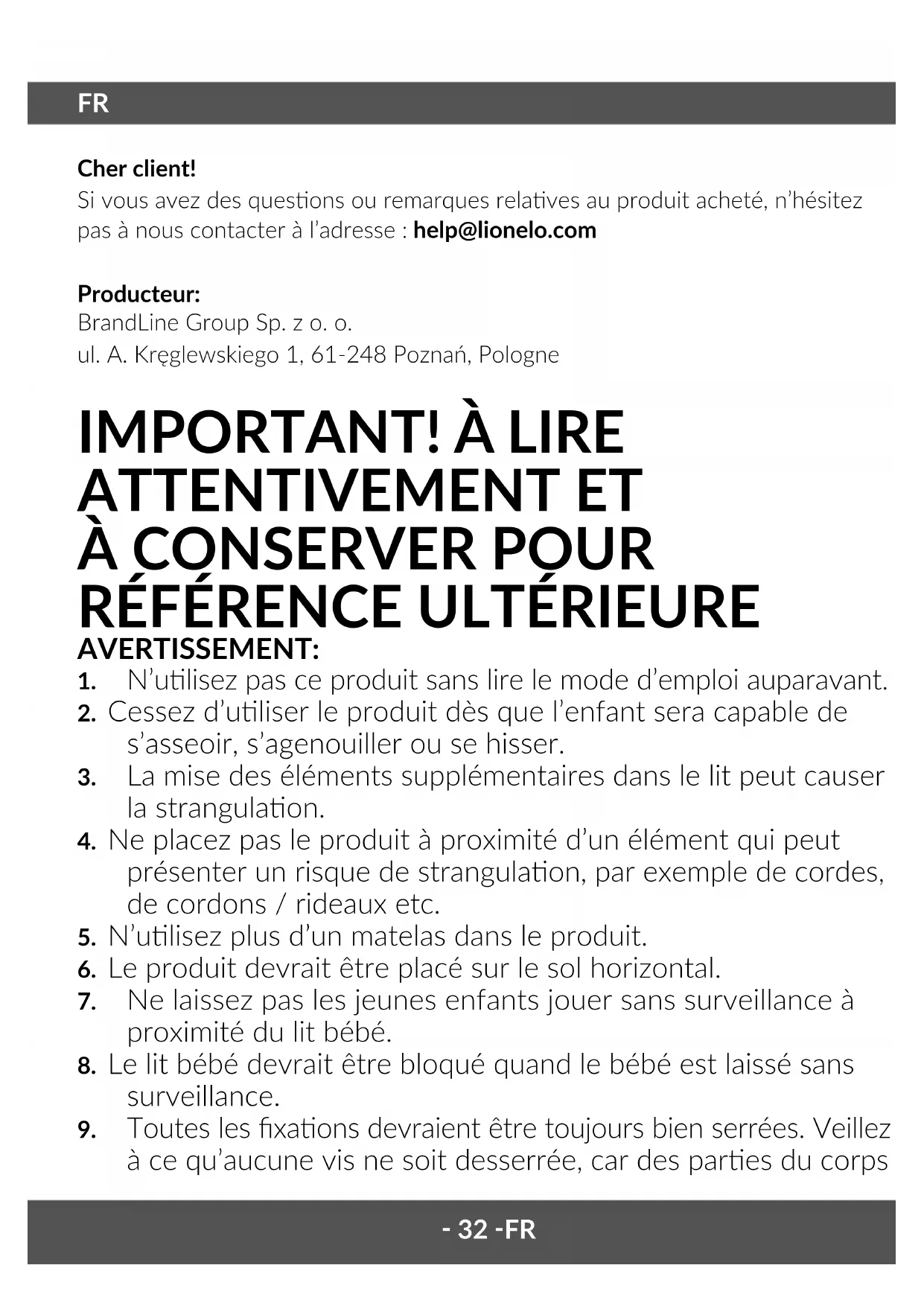 Cher client! Si vous avez des quesons ou remarques relaves au produit acheté, n’hésitez pas à nous contacter à l’adresse : help@lionelo.com Producteur: BrandLine Group Sp. z o. o. ul. A. Kręglewskiego 1, 61-248 Poznań, Pologne IMPORTANT! À LIRE ATTENTIVEMENT ET À CONSERVER POUR
