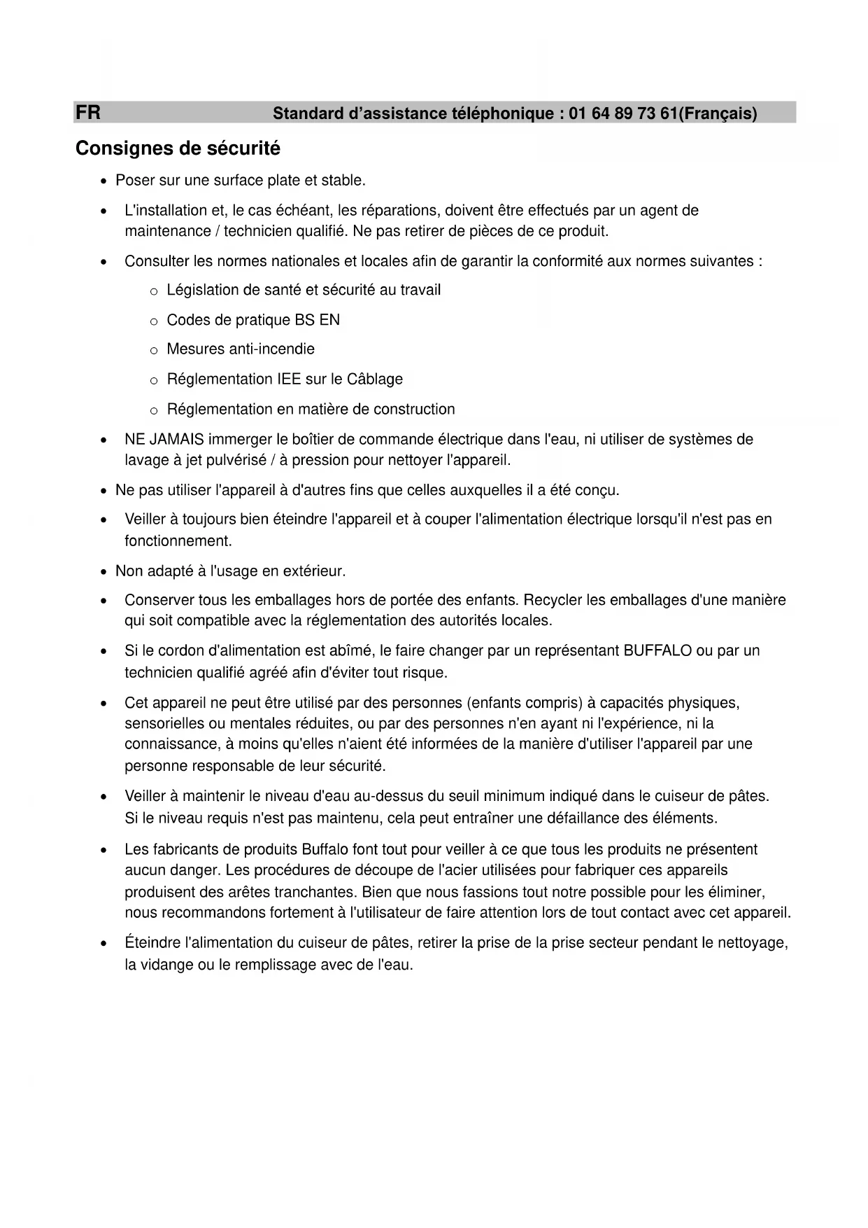 - Erdleiter (grün/gelb) an Klemme E Das Gerät muss über eine spezielle Erdleitung geerdet werden. Bei Fragen wenden Sie sich bitte an einen qualifizierten Elektriker. Elektroisolierpunkte dürfen nicht blockiert werden. Bei einem erforderlichen Notstopp müssen diese Punkte jederzeit sofort zugänglich sein. Konformität Das WEEE-Logo an diesem Produkt oder in der Dokumentation deutet darauf hin, dass das Produkt nicht im normalen Haushaltsmüll entsorgt werden darf. Um mögliche Gesundheits- bzw. Umweltschäden zu vermeiden, muss das Produkt durch einen zugelassenen und umweltverträglichen Recycling-Prozess entsorgt werden. Für weitere Informationen zur korrekten Entsorgung dieses Produkts wenden Sie sich bitte an den Lieferanten oder die für Müllentsorgung zuständige Behörde in Ihrer Nähe. Alle BUFFALO-Produkte werden strengen Tests unterzogen, um die Einhaltung von Normen und Spezifikationen internationaler und nationaler Behörden und unabhängiger Organisationen zu gewährleisten. BUFFALO-Produkte dürfen durch folgendes Symbol gekennzeichnet werden: Alle Rechte vorbehalten. Diese Anleitung darf ohne vorherige schriftliche Erlaubnis von BUFFALO weder ganz noch auszugsweise in irgendeiner Form und auf irgendeinem Wege – ob elektronisch, mechanisch, durch Fotokopieren oder anderweitig – vervielfältigt oder übertragen werden. Es werden alle Anstrengungen unternommen um sicherzustellen, dass alle Angaben bei Drucklegung korrekt sind. BUFFALO behält sich jedoch das Recht vor, Spezifikationen ohne Vorankündigung zu ändern.FR Standard d’assistance téléphonique : 01 64 89 73 61(Français) Consignes de sécurité Poser sur une surface plate et stable. L'installation et, le cas échéant, les réparations, doivent être effectués par un agent de maintenance / technicien qualifié. Ne pas retirer de pièces de ce produit. Consulter les normes nationales et locales afin de garantir la conformité aux normes suivantes : o Législation de santé et sécurité au travail o Codes de pratique BS EN o Mesures anti-incendie o Réglementation IEE sur le Câblage o Réglementation en matière de construction NE JAMAIS immerger le boîtier de commande électrique dans l'eau, ni utiliser de systèmes de lavage à jet pulvérisé / à pression pour nettoyer l'appareil. Ne pas utiliser l'appareil à d'autres fins que celles auxquelles il a été conçu. Veiller à toujours bien éteindre l'appareil et à couper l'alimentation électrique lorsqu'il n'est pas en fonctionnement. Non adapté à l'usage en extérieur. Conserver tous les emballages hors de portée des enfants. Recycler les emballages d'une manière qui soit compatible avec la réglementation des autorités locales. Si le cordon d'alimentation est abîmé, le faire changer par un représentant BUFFALO ou par un technicien qualifié agréé afin d'éviter tout risque. Cet appareil ne peut être utilisé par des personnes (enfants compris) à capacités physiques, sensorielles ou mentales réduites, ou par des personnes n'en ayant ni l'expérience, ni la connaissance, à moins qu'elles n'aient été informées de la manière d'utiliser l'appareil par une personne responsable de leur sécurité. Veiller à maintenir le niveau d'eau au-dessus du seuil minimum indiqué dans le cuiseur de pâtes. Si le niveau requis n'est pas maintenu, cela peut entraîner une défaillance des éléments. Les fabricants de produits Buffalo font tout pour veiller à ce que tous les produits ne présentent aucun danger. Les procédures de découpe de l'acier utilisées pour fabriquer ces appareils produisent des arêtes tranchantes. Bien que nous fassions tout notre possible pour les éliminer, nous recommandons fortement à l'utilisateur de faire attention lors de tout contact avec cet appareil. Éteindre l'alimentation du cuiseur de pâtes, retirer la prise de la prise secteur pendant le nettoyage, la vidange ou le remplissage avec de l'eau.Standard d’assistance téléphonique : 050-60006 (Belgique) FR Introduction Merci d'avoir acheté le cuiseur de pâtes électrique Buffalo. Avant toute utilisation de ce produit, veuillez lire attentivement ce mode d'emploi pour une utilisation sans problèmes et des résultats efficaces. Conservez ce mode d'emploi dans un endroit sûr pour toute référence ultérieure. Buffalo décline toute responsabilité en cas de défaillance du produit lorsque : Les instructions de ce manuel n'ont pas été suivies correctement, Du personnel non qualifié ou non autorisé a réglé le cuiseur de pâtes, Des pièces détachées non authentiques ont été utilisées, Le cuiseur de pâtes n'a pas été manipulé, ni nettoyé correctement, Le cuiseur de pâtes a été utilisé à des fins pour lesquelles il n'est pas conçu.