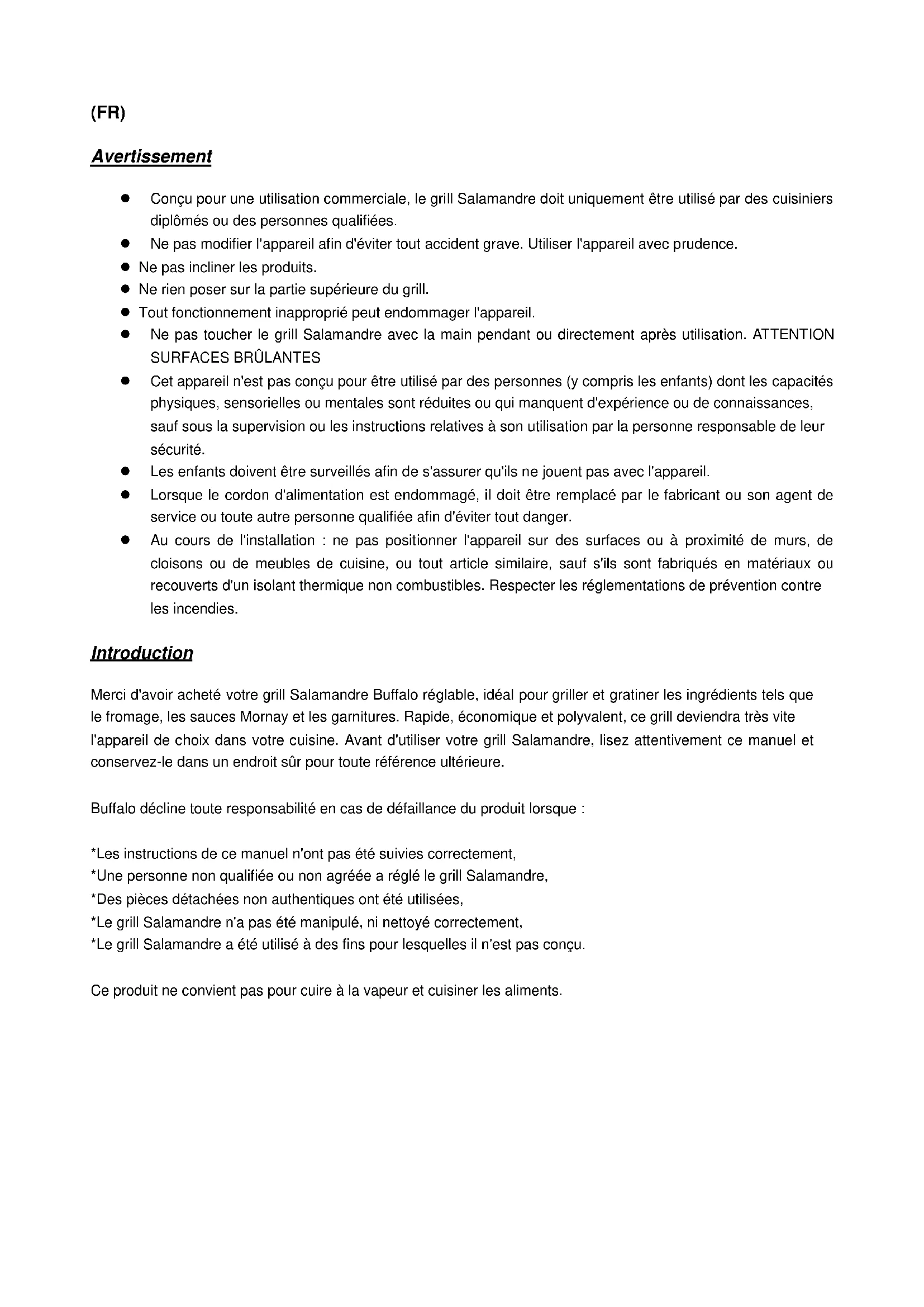 Cet appareil n'est pas conçu pour être utilisé par des personnes (y compris les enfants) dont les capacités physiques, sensorielles ou mentales sont réduites ou qui manquent d'expérience ou de connaissances, sauf sous la supervision ou les instructions relatives à son utilisation par la personne responsable de leur sécurité. Les enfants doivent être surveillés afin de s'assurer qu'ils ne jouent pas avec l'appareil. Lorsque le cordon d'alimentation est endommagé, il doit être remplacé par le fabricant ou son agent de service ou toute autre personne qualifiée afin d'éviter tout danger. Au cours de l'installation : ne pas positionner l'appareil sur des surfaces ou à proximité de murs, de cloisons ou de meubles de cuisine, ou tout article similaire, sauf s'ils sont fabriqués en matériaux ou recouverts d'un isolant thermique non combustibles. Respecter les réglementations de prévention contre les incendies. Introduction Merci d'avoir acheté votre grill Salamandre Buffalo réglable, idéal pour griller et gratiner les ingrédients tels que le fromage, les sauces Mornay et les garnitures. Rapide, économique et polyvalent, ce grill deviendra très vite l'appareil de choix dans votre cuisine. Avant d'utiliser votre grill Salamandre, lisez attentivement ce manuel et conservez-le dans un endroit sûr pour toute référence ultérieure. Buffalo décline toute responsabilité en cas de défaillance du produit lorsque : *Les instructions de ce manuel n'ont pas été suivies correctement, *Une personne non qualifiée ou non agréée a réglé le grill Salamandre, *Des pièces détachées non authentiques ont été utilisées, *Le grill Salamandre n'a pas été manipulé, ni nettoyé correctement, *Le grill Salamandre a été utilisé à des fins pour lesquelles il n'est pas conçu. Ce produit ne convient pas pour cuire à la vapeur et cuisiner les aliments.(FR) Emballage Buffalo est fier d'offrir qualité et service en s'assurant qu'au moment de l'emballage, tous les produits fournis sont en parfait état de fonctionnement et exempts de tout défaut. Cet emballage contient les éléments suivants : *Grill Salamandre réglable *Bac récepteur *Grille *Manuel En cas de dégâts causés suite au transport, veuillez contacter immédiatement votre revendeur Buffalo.