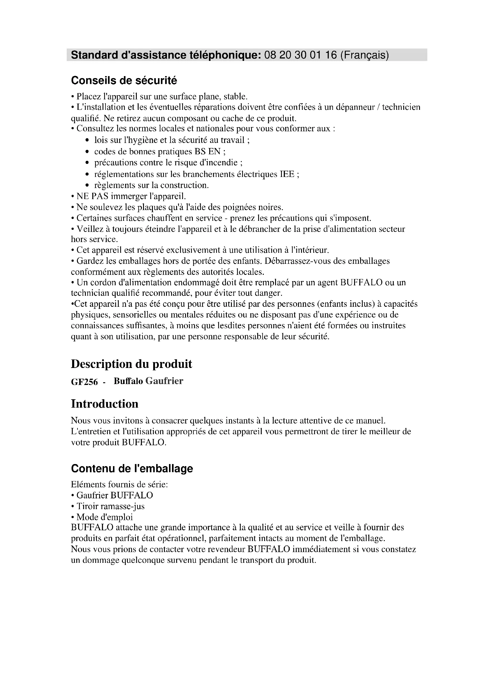 - Cet appareil n'a pas été conçu pour être utilisé par des personnes (enfants inclus) à capacités physiques, sensorielles ou mentales réduites ou ne disposant pas d'une expérience ou de connaissances suffisantes, à moins que lesdites personnes n'aient été formées ou instruites quant à son utilisation, par une personne responsable de leur sécurité. Description du produit GF256 - Buffalo Gaufrier Introduction Nous vous invitons à consacrer quelques instants à la lecture attentive de ce manuel. L'entretien et l'utilisation appropriés de cet appareil vous permettront de tirer le meilleur de votre produit BUFFALO. Contenu de l'emballage Eléments fournis de série: