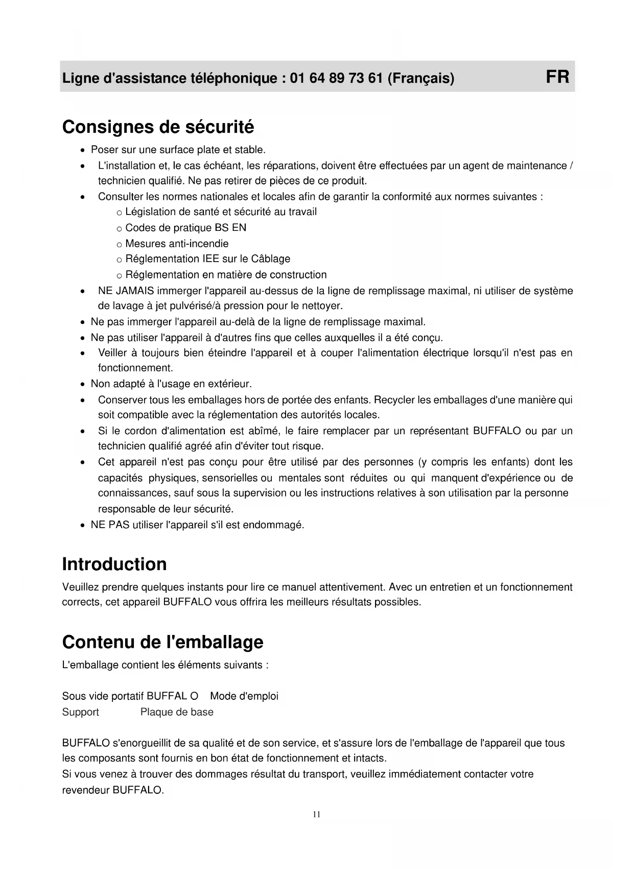 Alle rechten voorbehouden. Delen van deze instructies mogen uitsluitend worden geproduceerd of verzonden in welke vorm of via welke manier dan ook, inclusief o.a. elektronisch, mechanisch, door fotokopiëren, opnemen, met voorafgaande schriftelijke toestemming van BUFFALO. Er is alles aan gedaan om ervoor te zorgen dat de gegevens ten tijde van het afdrukken correct waren. BUFFALO behoudt zich echter het recht voor om de technische gegevens zonder mededeling te wijzigen11 Ligne d'assistance téléphonique : 01 64 89 73 61 (Français) FR Consignes de sécurité Poser sur une surface plate et stable. L'installation et, le cas échéant, les réparations, doivent être effectuées par un agent de maintenance / technicien qualifié. Ne pas retirer de pièces de ce produit. Consulter les normes nationales et locales afin de garantir la conformité aux normes suivantes : o Législation de santé et sécurité au travail o Codes de pratique BS EN o Mesures anti-incendie o Réglementation IEE sur le Câblage o Réglementation en matière de construction NE JAMAIS immerger l'appareil au-dessus de la ligne de remplissage maximal, ni utiliser de système de lavage à jet pulvérisé/à pression pour le nettoyer. Ne pas immerger l'appareil au-delà de la ligne de remplissage maximal. Ne pas utiliser l'appareil à d'autres fins que celles auxquelles il a été conçu. Veiller à toujours bien éteindre l'appareil et à couper l'alimentation électrique lorsqu'il n'est pas en fonctionnement. Non adapté à l'usage en extérieur. Conserver tous les emballages hors de portée des enfants. Recycler les emballages d'une manière qui soit compatible avec la réglementation des autorités locales. Si le cordon d'alimentation est abîmé, le faire remplacer par un représentant BUFFALO ou par un technicien qualifié agréé afin d'éviter tout risque. Cet appareil n'est pas conçu pour être utilisé par des personnes (y compris les enfants) dont les capacités physiques, sensorielles ou mentales sont réduites ou qui manquent d'expérience ou de connaissances, sauf sous la supervision ou les instructions relatives à son utilisation par la personne responsable de leur sécurité. NE PAS utiliser l'appareil s'il est endommagé. Introduction Veuillez prendre quelques instants pour lire ce manuel attentivement. Avec un entretien et un fonctionnement corrects, cet appareil BUFFALO vous offrira les meilleurs résultats possibles. Contenu de l'emballage L'emballage contient les éléments suivants : Sous vide portatif BUFFAL O Mode d'emploi Support Plaque de base BUFFALO s'enorgueillit de sa qualité et de son service, et s'assure lors de l'emballage de l'appareil que tous les composants sont fournis en bon état de fonctionnement et intacts. Si vous venez à trouver des dommages résultat du transport, veuillez immédiatement contacter votre revendeur BUFFALO.12