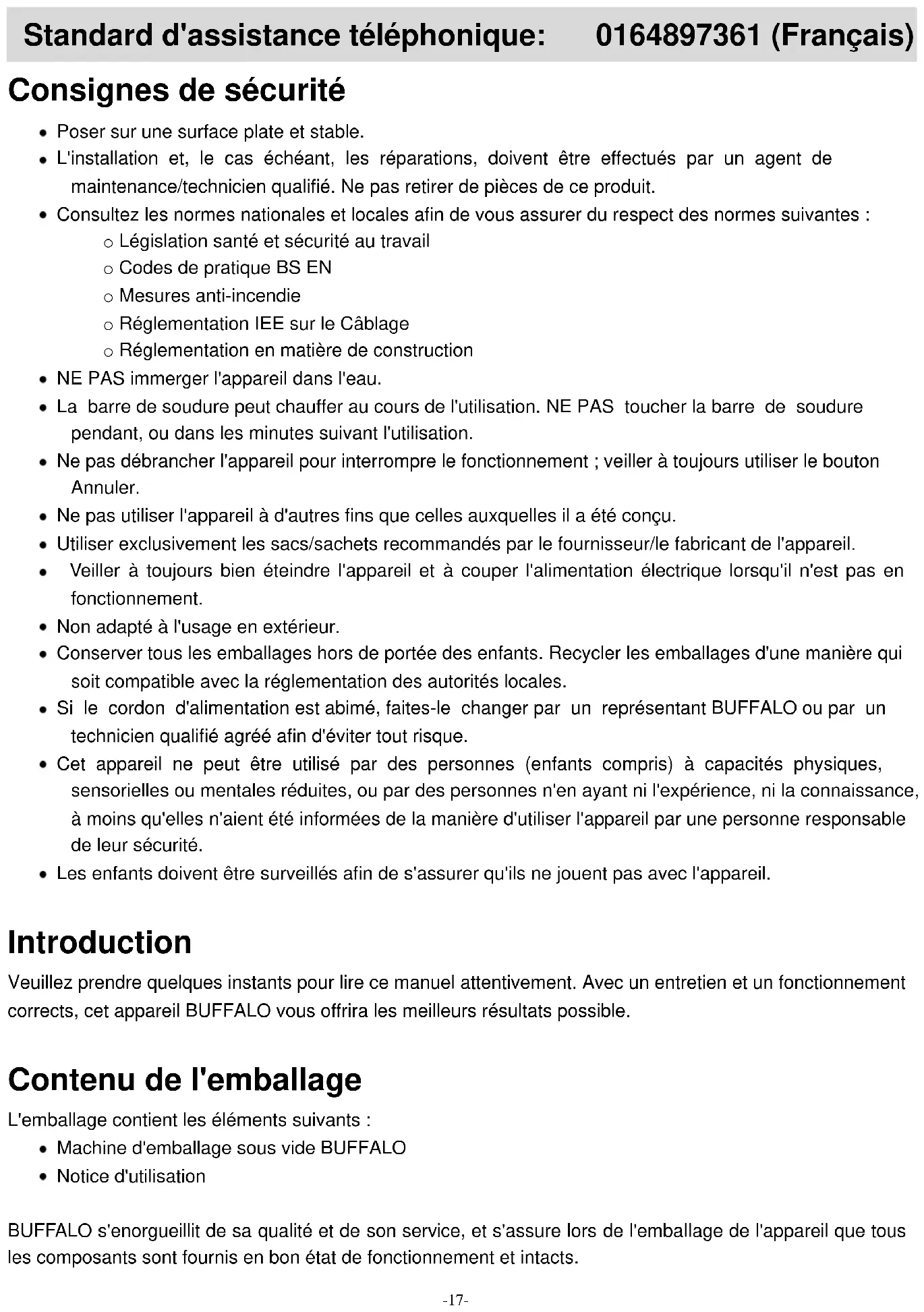 Alle Rechte vorbehalten. Diese Anleitung darf ohne vorherige schriftliche Erlaubnis von BUFFALO weder ganz noch auszugsweise in irgendeiner Form und auf irgendeinem Wege – ob elektronisch, mechanisch, durch Fotokopieren oder anderweitig – vervielfältigt oder übertragen werden. Es werden alle Anstrengungen unternommen um sicherzustellen, dass alle Angaben bei Drucklegung korrekt sind. BUFFALO behält sich jedoch das Recht vor, Spezifikationen ohne Vorankündigung zu ändern.-17- Standard d'assistance téléphonique: 0164897361 (Français) Consignes de sécurité Poser sur une surface plate et stable. L'installation et, le cas échéant, les réparations, doivent être effectués par un agent de maintenance/technicien qualifié. Ne pas retirer de pièces de ce produit. Consultez les normes nationales et locales afin de vous assurer du respect des normes suivantes : o Législation santé et sécurité au travail o Codes de pratique BS EN o Mesures anti-incendie o Réglementation IEE sur le Câblage o Réglementation en matière de construction NE PAS immerger l'appareil dans l'eau. La barre de soudure peut chauffer au cours de l'utilisation. NE PAS toucher la barre de soudure pendant, ou dans les minutes suivant l'utilisation. Ne pas débrancher l'appareil pour interrompre le fonctionnement ; veiller à toujours utiliser le bouton Annuler. Ne pas utiliser l'appareil à d'autres fins que celles auxquelles il a été conçu. Utiliser exclusivement les sacs/sachets recommandés par le fournisseur/le fabricant de l'appareil. Veiller à toujours bien éteindre l'appareil et à couper l'alimentation électrique lorsqu'il n'est pas en fonctionnement. Non adapté à l'usage en extérieur. Conserver tous les emballages hors de portée des enfants. Recycler les emballages d'une manière qui soit compatible avec la réglementation des autorités locales. Si le cordon d'alimentation est abimé, faites-le changer par un représentant BUFFALO ou par un technicien qualifié agréé afin d'éviter tout risque. Cet appareil ne peut être utilisé par des personnes (enfants compris) à capacités physiques, sensorielles ou mentales réduites, ou par des personnes n'en ayant ni l'expérience, ni la connaissance, à moins qu'elles n'aient été informées de la manière d'utiliser l'appareil par une personne responsable de leur sécurité. Les enfants doivent être surveillés afin de s'assurer qu'ils ne jouent pas avec l'appareil. Introduction Veuillez prendre quelques instants pour lire ce manuel attentivement. Avec un entretien et un fonctionnement corrects, cet appareil BUFFALO vous offrira les meilleurs résultats possible. Contenu de l'emballage L'emballage contient les éléments suivants : Machine d'emballage sous vide BUFFALO Notice d'utilisation BUFFALO s'enorgueillit de sa qualité et de son service, et s'assure lors de l'emballage de l'appareil que tous les composants sont fournis en bon état de fonctionnement et intacts.-18-