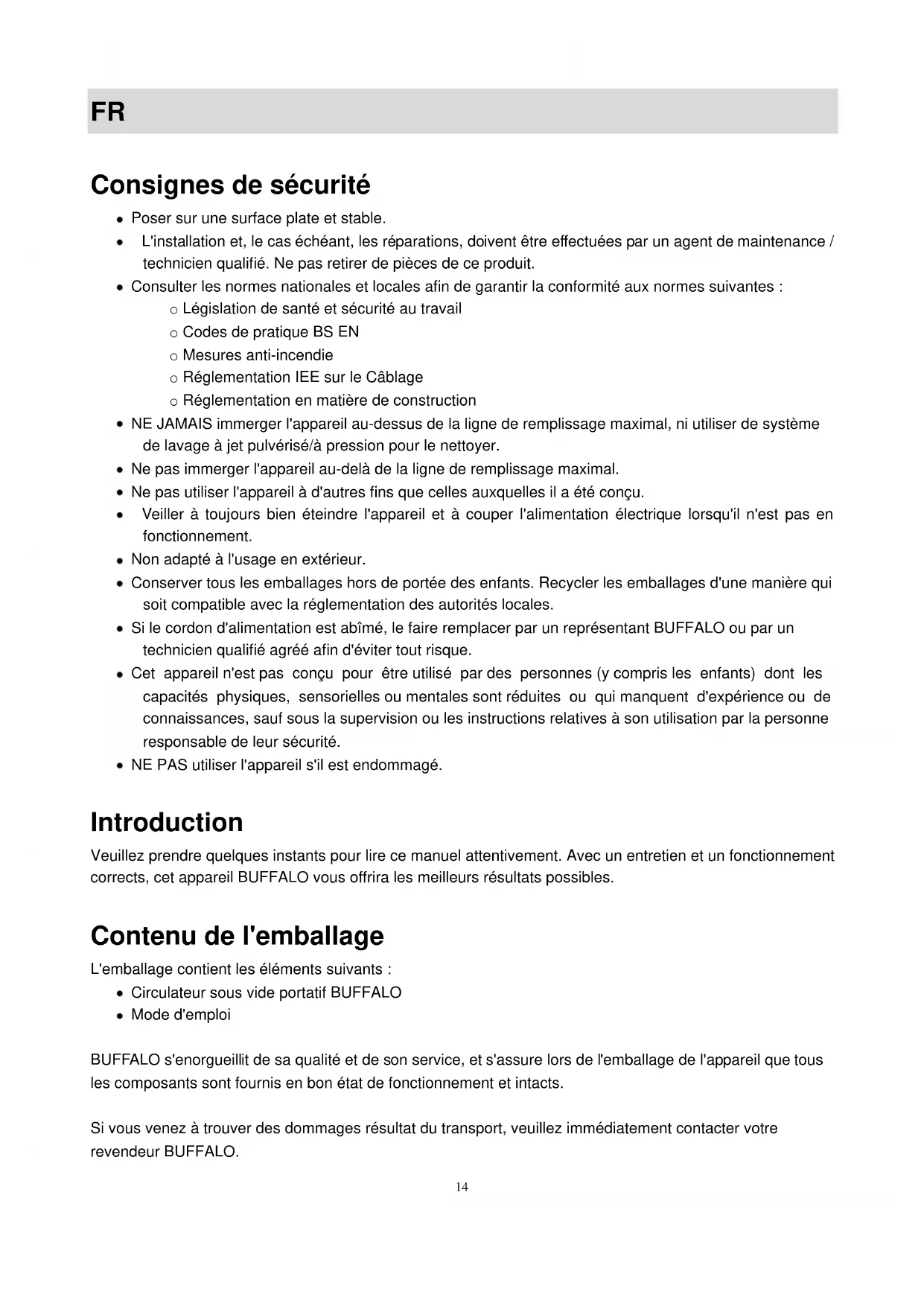 Consignes de sécurité Poser sur une surface plate et stable. L'installation et, le cas échéant, les réparations, doivent être effectuées par un agent de maintenance / technicien qualifié. Ne pas retirer de pièces de ce produit. Consulter les normes nationales et locales afin de garantir la conformité aux normes suivantes : o Législation de santé et sécurité au travail o Codes de pratique BS EN o Mesures anti-incendie o Réglementation IEE sur le Câblage o Réglementation en matière de construction NE JAMAIS immerger l'appareil au-dessus de la ligne de remplissage maximal, ni utiliser de système de lavage à jet pulvérisé/à pression pour le nettoyer. Ne pas immerger l'appareil au-delà de la ligne de remplissage maximal. Ne pas utiliser l'appareil à d'autres fins que celles auxquelles il a été conçu. Veiller à toujours bien éteindre l'appareil et à couper l'alimentation électrique lorsqu'il n'est pas en fonctionnement. Non adapté à l'usage en extérieur. Conserver tous les emballages hors de portée des enfants. Recycler les emballages d'une manière qui soit compatible avec la réglementation des autorités locales. Si le cordon d'alimentation est abîmé, le faire remplacer par un représentant BUFFALO ou par un technicien qualifié agréé afin d'éviter tout risque. Cet appareil n'est pas conçu pour être utilisé par des personnes (y compris les enfants) dont les capacités physiques, sensorielles ou mentales sont réduites ou qui manquent d'expérience ou de connaissances, sauf sous la supervision ou les instructions relatives à son utilisation par la personne responsable de leur sécurité. NE PAS utiliser l'appareil s'il est endommagé. Introduction Veuillez prendre quelques instants pour lire ce manuel attentivement. Avec un entretien et un fonctionnement corrects, cet appareil BUFFALO vous offrira les meilleurs résultats possibles. Contenu de l'emballage L'emballage contient les éléments suivants : Circulateur sous vide portatif BUFFALO Mode d'emploi BUFFALO s'enorgueillit de sa qualité et de son service, et s'assure lors de l'emballage de l'appareil que tous les composants sont fournis en bon état de fonctionnement et intacts. Si vous venez à trouver des dommages résultat du transport, veuillez immédiatement contacter votre revendeur BUFFALO.15 Ligne d'assistance téléphonique : 01 64 89 73 61 (Français) FR Fonction Écran ACL
