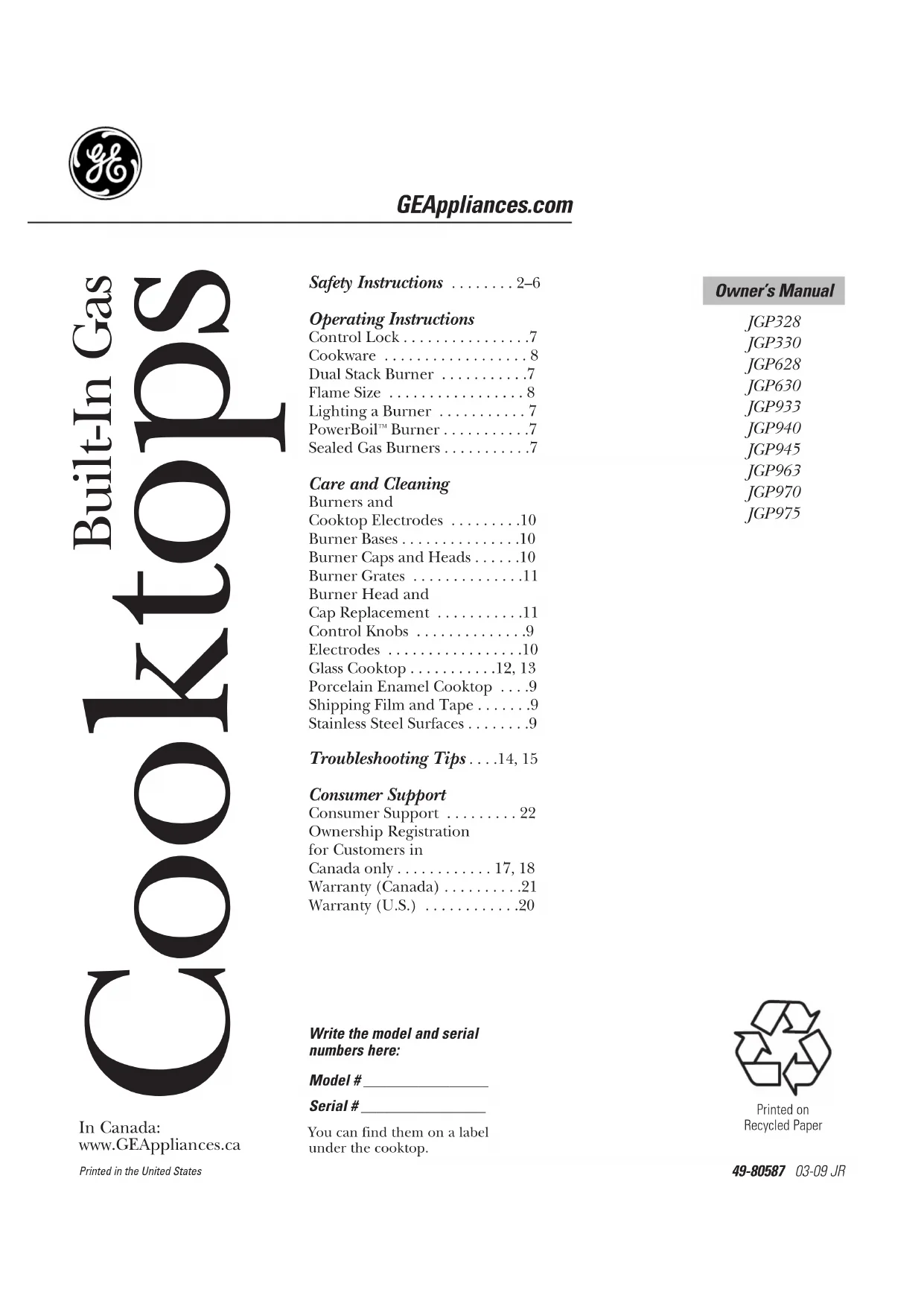 - Instructions contained in this manual cover procedures to be performed by any user. Other servicing generally should be referred to qualified service personnel. Caution must be exercised, since improper servicing may cause unsafe operation. Customers in Canada should consult the yellow pages for the nearest Mabe service center, or call 1.800.661.1616. Contact Us In the U.S.: GEAppliances.com If you are not satisfied with the service you receive from GE, contact us on our Website with all the details including your phone number, or write to: General Manager, Customer Relations GE Appliances, Appliance Park Louisville, KY 40225 In Canada: www.GEAppliances.ca, or write to: Director, Consumer Relations, Mabe Canada Inc. Suite 310, 1 Factory Lane Moncton, N.B. E1C 9M3 Register Your Appliance In the U.S.: GEAppliances.com Register your new appliance on-line—at your convenience! Timely product registration will allow for enhanced communication and prompt service under the terms of your warranty, should the need arise. You may also mail in the preprinted registration card included in the packing material. In Canada: www.GEAppliances.ca 22www.electromenagersge.ca 49-80587 03-09 JR JGP328 JGP330 JGP628 JGP630 JGP933 JGP940 JGP945 JGP963 JGP970 JGP975 Manuel du propriétaire Instructions de sécurité p. 2
