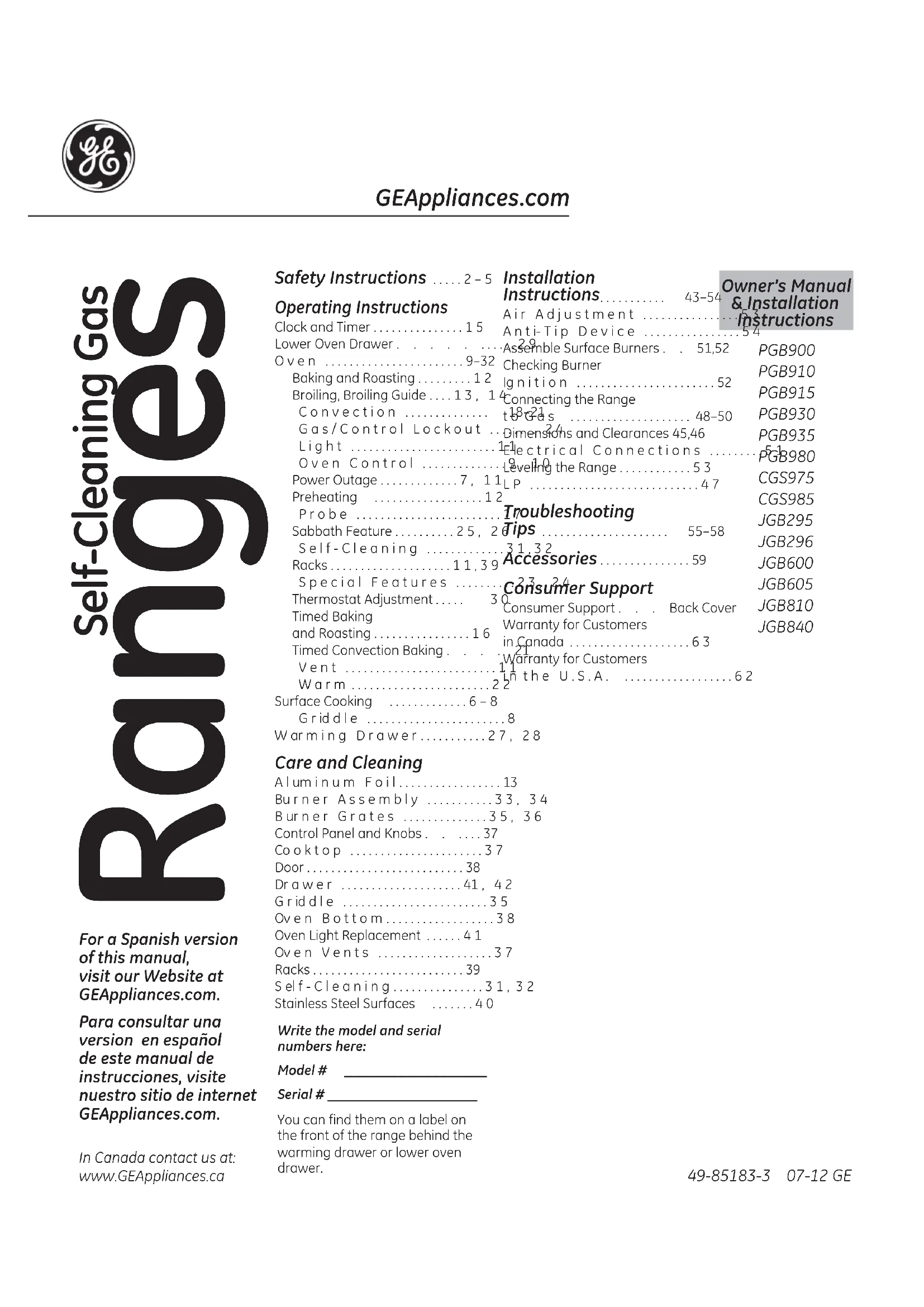 Adora JGB605DETBB - Cuisinière GE - Notice d'utilisation et mode d'emploi gratuit